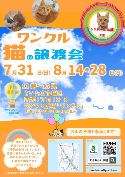 | イベント内容 | とらちゃん本舗 保護猫譲渡会を開催いたします! 7月31日(日) 8月14日(日) 8月28日(日) 11時~15時 さいたま市桜区西堀1-12-3ワンワン広場「ワンクル」埼京線 中浦和駅徒歩5分 個人ボランティアが保護している子猫、中猫、成猫様々な世代の子達が沢山参加予定です。 ぜひ足をお運び下さい。 ※当日のお渡しは出来ません。 ・当日咳および発熱の症状のある方はご来場をご遠慮ください。 ・ご参加の際はマスクの着用・アルコール消毒にご協力をお願いいたします。 ・入場前に検温をさせていただき、37℃以上の方はご参加いただけません。 ・事前予約優先制になります。 ※当日猫ちゃん・ワンちゃんの体調によりお休みになる子がおります。 前日blogにてお知らせいたします。 ※譲渡にはお願いごとがございます。譲渡条件をご確認下さい。 https://ameblo.jp/torachan-adp/entry-12717827948.html ご予約はこちらまで tora.honpo@gmail.com 以下の点を添えてお申し出ください。 ・お名前・人数 ・希望時間帯 (①11:00~②12:00~③13:00~④14:00~) ・会いたい猫がいれば猫の名前など |