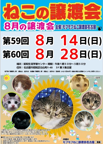 | イベント内容 | モフモフねこ譲渡会名古屋 猫たちの幸せなお家探しのために譲渡会を開催しております。 個人ボランティアの集まりです。 自分たちの出来ることから頑張っております! 一匹でも幸せになれる猫が増えますように 場所 昭和生涯学習センター 3階 第3集会室 住所 名古屋市昭和区石仏町1-48 時間 13時30分~15時30分 交通機関等 地下鉄鶴舞線及び桜通線「御器所」下車2番出口南約300m 3番出口南東約300m 駐車場24台(満車の場合は近隣コインPをご利用ください) 参加猫の情報は下記モフモフねこ譲渡会名古屋ブログにてご確認ください。 https://mofumofuneko4.fc2.net/ 新型コロナウイルス対策として ・会場は換気を定期的に行います。 ・密を避けるため、入場制限をさせていただきます。 ・入口にて手指の消毒、検温をお願いいたします。 ・ご来場の際はマスク着用をお願いいたします。 ・咳・発熱・倦怠感等の体調のすぐれない方はご来場を控えていただきますよう、お願いいたします。 ・新型コロナウイルスの影響により急遽中止になる場合もありますので、モフモフねこ譲渡会名古屋ブログにてご確認の上、ご来場ください。 【譲渡会について】 ・譲渡会は入場無料、予約不要です。お気軽にご参加ください。 ・会場へのお問い合わせはご遠慮ください。 ご質問は下記メールアドレスへお願いいたします。 mofumofuneko4☆gmail.com ☆を@に変更してお問い合わせください。 ・猫の引き取りはしておりません。 ・譲渡会当日に猫をお渡しすることはありません。 ・保護主によって譲渡条件が違う場合があります。 ・参加予定でも譲渡会前にトライアルになる場合があります。 ご希望の猫がいましたらまずはお問い合わせをお願いいたします。 【参加猫について】 ・ノミ駆除、駆虫、トイレ躾、ワクチン3種接種済。 ・年齢や健康状態に応じて、避妊手術を行っております。 ・参加予定で紹介していても当日体調不良等で欠席になる場合があります。 【譲渡の約束事】 ・ペット飼育可の住宅にお住まいの方。 ・完全室内飼育。 ・脱走防止の対策をしていただける方。 ・避妊手術未実施の場合、避妊手術 の実施と報告をしていただける方。 ・ご家族全員が猫を飼うことに同意していること。 ・譲渡後、しばらく定期連絡を入れていただける方。 *お一人暮らしの方、60歳以上の方は、身内の方の保証が必要となる場合がございます。 #名古屋昭和区 #昭和生涯学習センター #譲渡会 #保護猫 #地域猫 #さくらねこ #tnr #里親募集 #里親募集中 #猫 #ねこ #殺処分ゼロ #買わずに飼おう #モフモフねこ譲渡会名古屋 #ペットショップに行く前に #譲渡会のお知らせ #猫と暮らしたい |