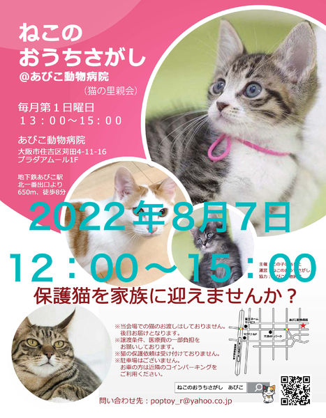 | イベント内容 | 座敷形式のアットホームな里親会です♪ 子猫〜大人猫まで多数参加します♪ 参加猫情報は下記のブログにてご紹介していきます(^^) ブログで掲載の子以外も参加するかもしれません★彡 https://ameblo.jp/jillrill/theme-10105668887.html ※今回、少しでも密を避けるため、12:00〜の開始となります。 混み具合によってお待ちいただく場合がございます。 ※緊急事態宣言の発令などにより、里親会の開催を中止する場合があります。 第36回☆ねこのおうちさがし@あびこ動物病院 日時 : 2022年8月7日(日) 時間 : 12時00分〜15時00分 場所 : あびこ動物病院 大阪市住吉区苅田4-11-16 地下鉄御堂筋線あびこ駅北一番出口より650m、徒歩8分 ☆駐車場はございませんので、近隣のコインパーキングをご利用ください。 近隣のご迷惑にならないよう、路上駐車はされませんようお願いします。 ☆会場へのお問い合わせは固くお断りします。 (場所をご提供くださるだけなので、参加猫のについてはご存知ありません) ★譲渡には完全室内飼育、同意書への署名・捺印などの 条件、医療費の一部負担があります。 ★猫ちゃんは、後日お届けとなります。 当日連れて帰ることはできません。 ★参加予定の猫ちゃんは、里親会の前に里親さまが決定する場合や、体調により不参加となる場合があります。 主催:この子のあした 運営:ねこのおうちさがし 協力:あびこ動物病院 問い合わせ先 : poptoy_r☆☆☆yahoo.co.jp (☆☆☆を@に変更してください) ※スジュールにより来場できないけど気になる子がいらっしゃる場合、お問い合わせ頂きましたら、アンケートにお答え頂いたのち保護主さんにお繋ぎいたします。 |