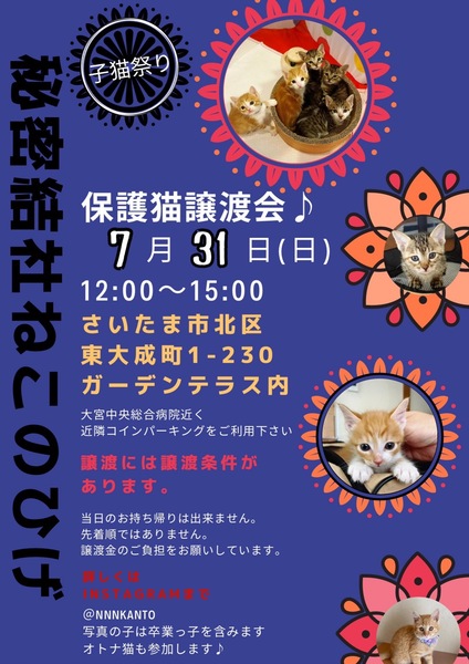 | イベント内容 | 【秘密結社ねこのひげ♡保護猫譲渡会】 7/31(日) 12:00~15:00 さいたま市北区東大成町1-230 ガーデンテラス内にて開催します☆ 今回も! 【仔猫祭】(*ノ´∀`*)ノワッショイ♪ 20頭ほどの3~4ヶ月齢の仔たちが キャッキャ♪キャッキャ♪ と参加します。 もちろんナイスモフな オトナ猫さんも♡ ●参加メンバー(Instagram) @chotocha @kuro_mamegram @nanashin.3 @miko_manma @charopondaifuku 家族にするなら保護猫だべ♪♪ こんなご時世だけど 新しい家族と笑顔で暮らしたい♪ という方は是非会いにいらしてください♡ 新型コロナ対策として 受付名簿のご記入、消毒、 マスク着用などのご協力をお願い致します。 物販の方も屋外スペースにて こじんまり置かせて頂きますので ご近所の方はふらりと是非 お立ち寄りくださいませ。 @yonayona2222 ご不明な点がございましたら インスタグラム @秘密結社ねこのひげ の DMまでお問い合わせ下さい♪ 激アツな出逢いがありますように❣️ |