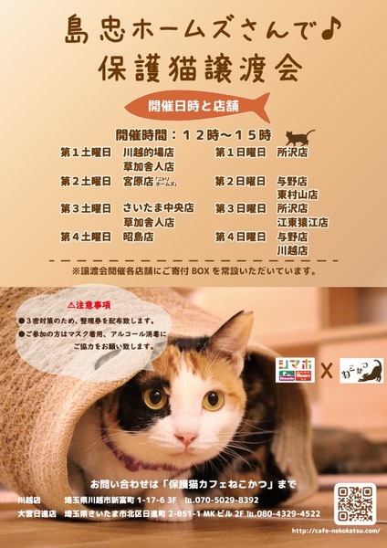 | イベント内容 | 毎月第一土曜日に、保護猫カフェ「ねこかつ」主催の譲渡会を開催しています。 子猫から成猫まで沢山の猫達が参加予定です。 【注意事項】 ・3密対策のため、当日11時30分より整理券を配布いたします。 ・各回先着3組様、15分間ご入場いただけます。 ・マスク着用、アルコール消毒のご協力をお願いいたします。 ・当日は検温の上、体温が37℃以上の方はご参加いただけません。 ⌒*。*゚*⌒*゚*。*⌒*。*゚*⌒* ゚*。*⌒*。*゚ 店舗には、ご寄付ボックスを常設していただいています。 こちらへ入れられたご支援品は、保護猫達の為に使わせていただきます。 何卒よろしくお願いいたします。 ⌒*。*゚*⌒*゚*。*⌒*。*゚*⌒* ゚*。*⌒*。*゚ たくさんの素敵なご縁がありますように♪ お問い合わせは下記まで♪ ーーーーー 保護猫カフェねこかつ Tel:070-5029-8392 ーーーーー |