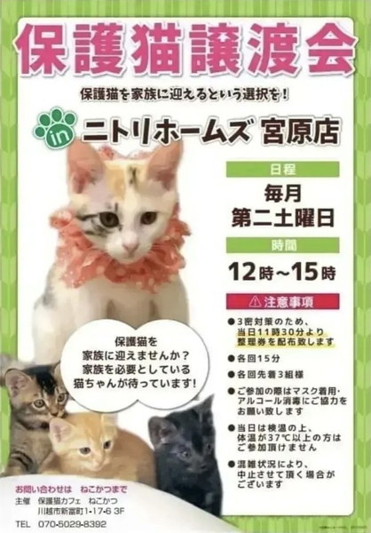| イベント内容 | 毎月第二土曜日に、保護猫カフェ「ねこかつ」主催の譲渡会を開催しています。 子猫から成猫まで沢山の猫達が参加予定です。 【注意事項】 ・3密対策のため、当日11時30分より整理券を配布いたします。 ・各回先着3組様、15分間ご入場いただけます。 ・マスク着用、アルコール消毒のご協力をお願いいたします。 ・当日は検温の上、体温が37℃以上の方はご参加いただけません。 ⌒*。*゚*⌒*゚*。*⌒*。*゚*⌒* ゚*。*⌒*。*゚ 店舗には、ご寄付ボックスを常設していただいています。 こちらへ入れられたご支援品は、保護猫達の為に使わせていただきます。 何卒よろしくお願いいたします。 ⌒*。*゚*⌒*゚*。*⌒*。*゚*⌒* ゚*。*⌒*。*゚ たくさんの素敵なご縁がありますように♪ お問い合わせは下記まで♪ ーーーーー 保護猫カフェねこかつ Tel:070-5029-8392 ーーーーー |