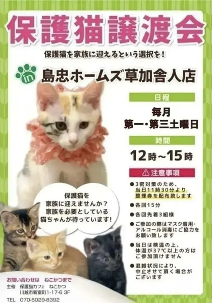 | イベント内容 | 毎月第一、第三土曜日に、保護猫カフェ「ねこかつ」主催の譲渡会を開催しています。 子猫から成猫まで沢山の猫達が参加予定です。 【注意事項】 ・3密対策のため、当日11時30分より整理券を配布いたします。 ・各回先着3組様、15分間ご入場いただけます。 ・マスク着用、アルコール消毒のご協力をお願いいたします。 ・当日は検温の上、体温が37℃以上の方はご参加いただけません。 ⌒*。*゚*⌒*゚*。*⌒*。*゚*⌒* ゚*。*⌒*。*゚ 店舗には、ご寄付ボックスを常設していただいています。 こちらへ入れられたご支援品は、保護猫達の為に使わせていただきます。 何卒よろしくお願いいたします。 ⌒*。*゚*⌒*゚*。*⌒*。*゚*⌒* ゚*。*⌒*。*゚ たくさんの素敵なご縁がありますように♪ お問い合わせは下記まで♪ ーーーーー 保護猫カフェねこかつ Tel:070-5029-8392 ーーーーー |