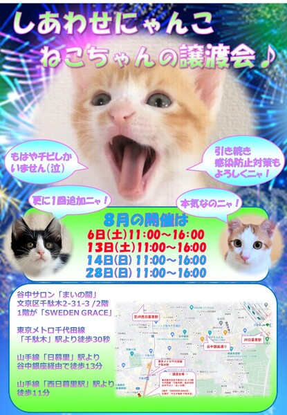 | イベント内容 | 「しあわせにゃんこ」は行き場のない猫ちゃんと里親様との 出逢いの場を提供するグループです♪ 子猫も成猫もハンデのある猫もみんな新しい家族を待っています♪ みなさまのご来場を保護主、スタッフ一同心よりお待ちしております♪ 開催にあたり感染対策として各種制限等を設けております。 ※詳しくはホームページ譲渡会情報をご確認願います。 http://www.shiawasenyanko.net/jyoutokai.html まさかの土日2デイズ( ゚Д゚) チビッコテンコ盛りの夏がやってきました! 夏休みは旅行もイイけど保護猫と過ごすのもアリじゃない? ◆開催日/開催時間◆ 2022年8月13日(土) 11:00~16:00 感染者数の状況により開催の可否を判断させて頂きます。 ご希望の猫ちゃんがいらっしゃる場合は11時30分までに受付をお願い致します。 複数のお申し込みがある場合は11時30分で受付を終了させて頂く場合がございます。 受付をされた全ての里親様とお見合いをさせて頂きます。 ※先着順ではございません。 ※当日、猫ちゃんを連れて帰ることは出来ません。 後日調整のうえ保護主が里親様宅へお届けいたします。 ◆会場◆ 受付はまいの間1階です♪ 直接会場までお越し下さい♪ 譲渡会場:東京都文京区千駄木2-31-3 1階が北欧雑貨ショップ「SWEDENGRACE」 2階が谷中サロン「まいの間」 ※詳しいアクセスはホームページ案内図をご覧下さい http://www.shiawasenyanko.net/mapmainoma.pdf 谷中サロン「まいの間」の情報はこちら http://neko-to-kyo.com/#maima ◆交通手段◆ 東京メトロ千代田線「千駄木」駅より徒30秒 JR山手線「西日暮里」駅より徒歩11分 JR山手線「日暮里」駅より谷中銀座経由で徒歩13分 ※お車でご来場の際、駐車場のご用意はございません。 近隣のコインパーキング等をご利用ください。※近隣に沢山あります。 いつ里の掲載参加猫一覧はこちらから https://satoya-boshu.net/mypage/foster_list.php?@ps@=none アメーバブログの里親募集にゃんこはこちら https://ameblo.jp/shiawasenyan-ko/theme-10092719565.html ◆猫ちゃんとのお見合い◆ 掲載している猫ちゃんは基本的に譲渡会場でのお見合いのみとなります。 譲渡会への参加が決定している猫ちゃんはその譲渡会で里親様が決定しなかった場合のみ保護主宅でのお見合いが可能となります。 自宅お見合いを希望される里親様はメール(info@shiawasenyanko.net)にてご相談ください。 ◆当譲渡会では猫ちゃんと里親様のスキンシップを大切にしています◆ 新しい家族として20年以上いっしょに暮らしていく猫ちゃんです。 譲渡会場でたくさんの猫ちゃんと触れ合って良きパートナーを見つけてください。 はじめて猫ちゃんを迎える不安や先住猫ちゃんとのトライアルの注意点、猫ちゃんと里親様の暮らし方など気軽にご相談ください。 経験豊富な保護主や猫大好きスタッフがアドバイスさせていただきます。 ◆子猫ご希望の里親様◆ 子猫は急な下痢や発熱等により体調が急変し、数時間対応ができなかっただけでも命を落とす事があります。 その為、当譲渡会では月齢によりお留守番のない又は少ないご家庭への譲渡に限らせて頂いております。 また里親様と子猫ちゃんが安心してトライアル期間を過ごせるよう体重が1㎏程になってからのお届けとさせて頂いております。 ◆里親希望のみなさまへ◆ ご家族の皆様で生涯、家族の一員としてたっぷり愛情を注いでくださるご家庭をお待ちしております。 下記に該当する希望者様へ ・独身、単身者の方 ・友人同士、同棲でのお住まいの方 ・高齢者のみのご家庭の方 は、ご相談の上、譲渡を判断させて頂きます ・適正飼育の不可能な方 ・脱走防止対策を考えて頂けない方 ・定期報告の不可能な方 は、ご遠慮下さいますようお願い致します ◆ご負担頂く費用について◆ 譲渡の際に譲渡負担金(医療費の一部、譲渡金、お届け時の交通費)を里親様にご負担頂く事により 過酷な状況にいる猫ちゃんを保護し新しいご家族の元へ送り出す事ができています。 皆様のご理解とご協力にボランティア一同、心より感謝しております。 ご負担頂く医療費につきましてはホームページに詳しく記載させて頂いております。 http://www.shiawasenyanko.net/onegai.html しあわせにゃんこホームページ http://www.shiawasenyanko.net メールでのお問い合わせ info@shiawasenyanko.net |