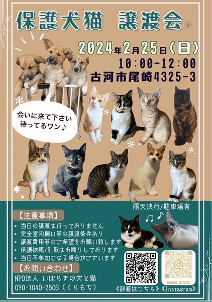 | イベント内容 | 参加ご希望の方はポスターの連絡先までお問い合わせください 写真に載っていない子もたくさん参加します とりあえず犬猫に会ってみたい方の参加も歓迎です 皆さまのご参加をお待ちしています いばらきの犬と猫 https://2013inutoneko.jimdofree.com/ |