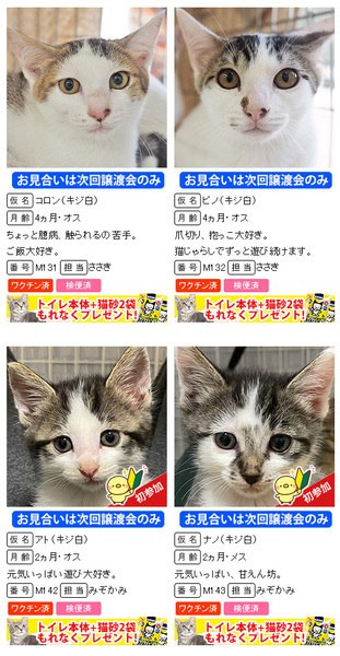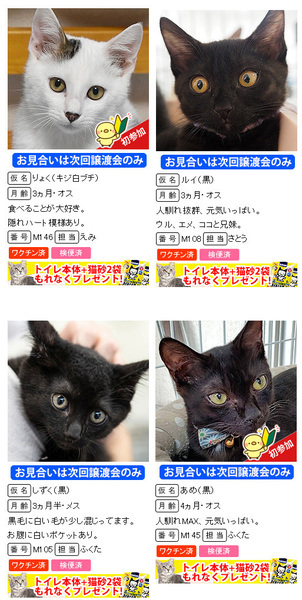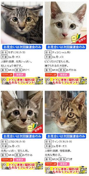 | イベント内容 | 8月28日(日)/10時~15時 三好ヶ丘カリヨンハウスイベント広場(冷房完備) 愛知県みよし市三好丘2-2-1 *無料駐車場48台、近隣に大型コインPあり 子猫だけ37匹の譲渡会!数が多すぎます(;・∀・) 子猫だけ!子猫だけ37匹!!萌えすぎ注意!!! ↓参加子猫↓ http://miyoshineko.sblo.jp/article/189760495.html 【ご来場前にお読みください】 体調不良等で不参加になる猫もございます。 子猫の譲渡会は大変混み合います。 混雑時は入場制限を行う場合があります。 猫は早いもの勝ちではございません。 すべての希望者とお話しをしてトライアル先は抽選で決まります。 当選された方のみ担当者からご連絡を差し上げます。 <譲渡までの流れ及び譲渡手数料> http://miyoshineko.sblo.jp/article/187085341.html ※一般参加の猫は譲渡基準、手数料、ワクチン代、治療費が異なります。 譲渡会場でご確認ください。 ------------------------ ■NPO法人三好ネコの会 http://miyoshi-neko.jp ■amazon欲しいものリストから支援お願いします http://miyoshi-neko.jp/fund |