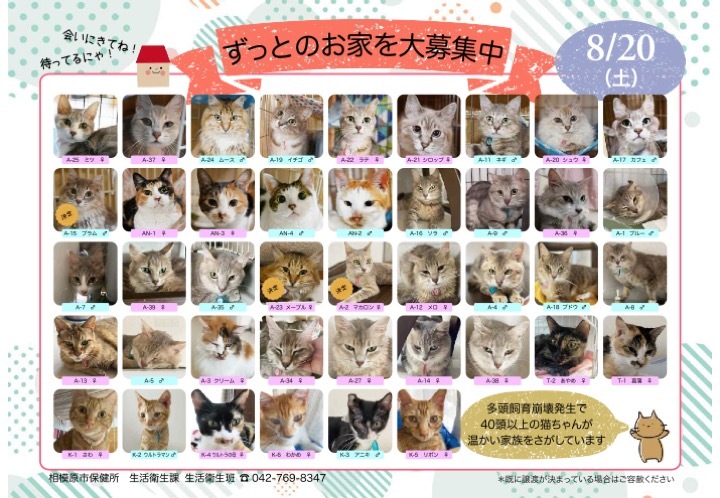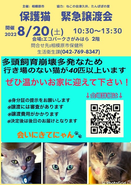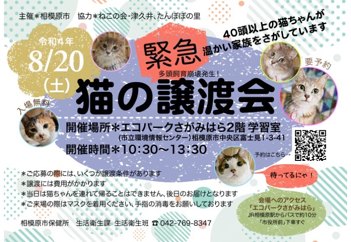 | イベント内容 | 相模原市は動物愛護センターがない中、多頭飼育崩壊が続きました。 協力団体の預かり数も限界になり、収容保護された猫さんたちの行き場に窮しています。 そうした中、相模原市保健所生活衛生課主催で猫の譲渡会を緊急に開催することになりました。 飼い主になるための条件を満たした新たな飼い主さんを募集しています。 飼い主の条件など詳細は、市ホームページ(譲渡会URL)をご覧ください。 【参加方法】 事前に相模原市のホームページ(譲渡会URLもしくはQRコード)の「参加方法」内の入力フォームから、譲渡会に参加する時間帯を予約してください。 インターネット予約ができない方は、電話で予約も可能です。 問い合わせ先 相模原市生活衛生課 直通電話 042-769-8347 行き場のない猫さんたちが1頭でも多く新しいご家族に迎えられ 幸せに暮らすことができますように みなさまのお力添えを是非よろしくお願いいたします<m(__)m> 協力団体:たんぽぽの里、ねこの会・津久井 ※猫リスト:写真参加のみの猫さんや譲渡会までに譲渡が決まった猫さんもいます。ご了承ください。 |