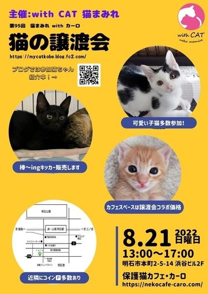 | イベント内容 | 猫の譲渡会 日時:8月21日(日)13時から17時まで 場所:明石市本町2-5-14 浜谷ビル2階 保護猫カフェ・カーロ (お問合せはカーロさんにしないようにお願いします) 子猫がたくさん参加しています♪ 本気で猫を飼いたい方是非ご来場ください 早い順ではございませんが早くに決まってしまう場合がございますので お早めにお越しいただくか面会予約をお願いします ※無料ではありません ※当日連れて帰れません ※譲渡条件があります ●参加猫たちのお紹介やお問い合わせ(面会予約等)は ブログよりご連絡お願いします https://mycatkobe.blog.fc2.com/ |
