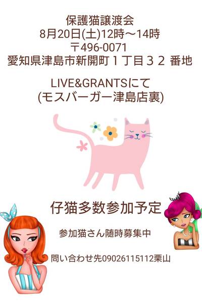 | イベント内容 | 仔猫多数。本当に沢山居ます。大人の猫も沢山居ます。スタッフも皆中高年、保護猫を沢山保護し、抱えるには先が短すぎるので、今からまだまだ生きる猫さん達に、新しい家族を希望します! |
