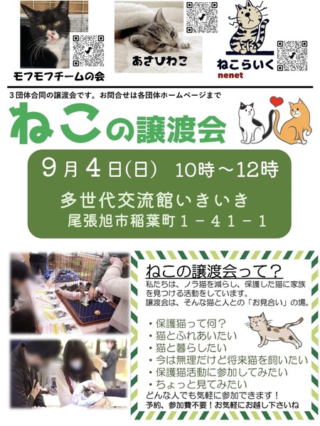 | イベント内容 | 【ポイント!】 ★ウイルスチェックなど健康診断済み! 20匹ほど参加予定です。 【日時】 9月4日 (日) 10時~12時 【場所】 尾張旭市 多世代交流館 いきいき 地元で活動するモフモフチームの会・あさひねこ、名古屋で活動するねこらいく 3団体共催です。 各団体、譲渡条件・譲渡費用があります。 詳しくはお問い合わせください。 なお、当日、猫の引き渡しはしておりません。 後日、ご自宅へお届けとなります。 当日は感染症対策のため、マスクの着用をお願いいたします。 モフモフチームの会 https://instagram.com/jiji_puu?utm_medium=copy_link あさひねこ http://owariasahineko.blog.fc2.com/ ねこらいく https://nekonetwork.com/ |