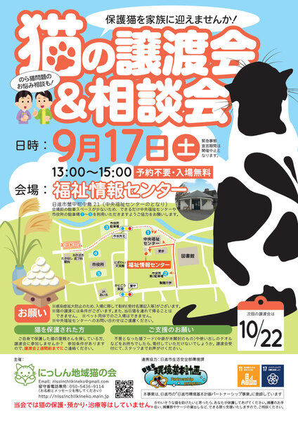 | イベント内容 | 9月17日(土)に「猫の譲渡会」を開催いたします。 猫少なめのミニ譲渡会&相談会です。 保護猫を迎えたい方はもちろん、ご近所との猫トラブルなどでお悩みの方もお気軽にお立ち寄りください!(^^)/ 緊急事態宣言中は開催中止となります。 また、感染症拡大防止のため、入場に際して制約がございますので、ご理解・ご協力をお願いいたします。詳細は、ホームページにて随時更新いたします。 【日時】2022年9月17日(土)13:00〜15:00 【会場】福祉情報センター(中央福祉センターとなり) 【主催】にっしん地域猫の会 【ホームページ】http://nissinchiikineko.main.jp ※入場無料・予約不要です。 ※会場前に駐車場がございますが、数が少ないため、満車の場合は中央福祉センターか日進市役所の駐車場をご利用ください。図書館向かいにも市役所の臨時駐車場がございます。 ※ペット同伴のご入場はできませんので、予めご了承ください。 ※感染症拡大防止対策として、室外でお待ちいただく場合や室内換気のため冷暖房が効きにくいことがございます。 ※猫ちゃんの譲渡には条件がございます。詳細はホームページをご参照ください。 |