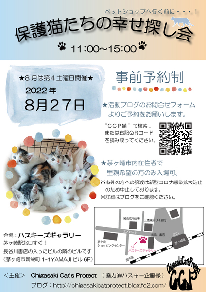 | イベント内容 | 茅ヶ崎産まれ、茅ヶ崎育ちの猫たちが新しい家族とのご縁を待っています。 新型コロナ感染拡大防止のため、 茅ヶ崎市内在住の里親希望者さまのみの事前予約制とさせていただきます。 詳しくは活動ブログをご確認ください。 http://chigasakicatprotect.blog.fc2.com/blog-entry-2127.html 予めメールにてアンケートを送っていただき ご予約を取っていただくという流れを取っております。 万が一のことがあってはいけないので ご面倒をおかけいたしますが どの子にするか決まっていない方も 予めアンケートを添えてご予約のお問合せをお願い致します。 譲渡条件をご確認のうえ、 ご理解いただけた場合のみアンケートを添えてメールを送ってください。 ※先住猫さんが居る場合は必ず 猫コロナ抗体価検査を実施していただきますようお願い致します。 猫コロナ抗体価実施についてはこちらの記事をご覧ください。 http://chigasakicatprotect.blog.fc2.com/blog-entry-2350.html 予約時間は11時~15時までの間で ①11時~2枠 ②12時~2枠 ③13時~2枠 ①~③までの時間帯でのご予約をお願い致します。 それぞれ1時間しっかり見ていただける時間がございますので 里親希望者様はお問合せフォームから事前予約をしたうえでご希望の時間をご記入の上、指定時間にご来場ください♪ ※アンケートを添えてお問合せをお願い致します※ ※事前予約の無い方は入場できません。ご了承ください。 ※マスク必須(マスクをお持ちでない方は当会にて販売している手作りマスクを購入していただきます) ※入場時、CCP里親希望者用アンケート及び 保健所からの指示に従い ご住所、年齢、勤務先(学校)の場所(市町村名まで)、家族構成、 家族の中にここ2週間以内に咳や発熱の症状が無かったかの有無、 来場時非接触型検温器での体温計測の上、新型コロナウイルス感染予防のためのアンケートを記載していただきます。 |
