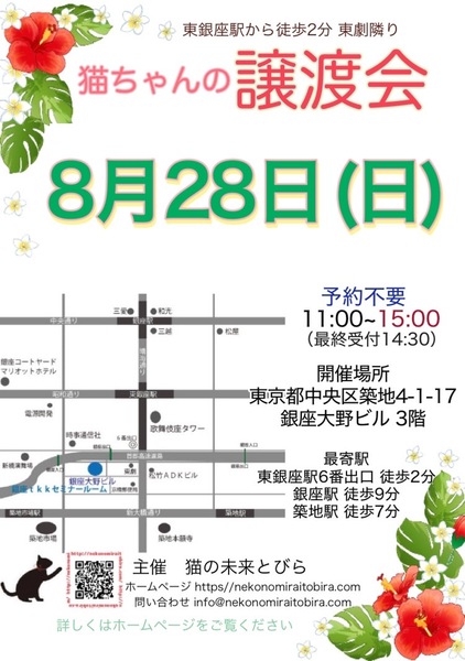 | イベント内容 | 恵まれない環境にいる猫たちが未来へのとびらを開いて幸せなご縁に繋がる橋渡しをしていきます。 たくさんの猫ちゃんと保護主・スタッフ一同みなさまのご来場を心よりお待ちしています! 子猫ちゃん〜成猫ちゃんまで参加します♪ ※ご来場頂く方と私たち保護主、スタッフの安心と安全の為、感染リスクを限りなく低減させる為、私たちが出来うる対策をしてお待ちしております※ 【ご来場いただく皆様には下記についてお願い致します】 ★不織布マスクの着用をお願い致します。 (マスク着用のない方は入場出来ません) ★譲渡会場にお入り頂く前に検温・手洗いと手の消毒、検温をお願い致します。 ★ソーシャル・ディスタンス(人と人との間隔を開ける)をお願い致します。 ★熱のある方や体調の優れない方は譲渡会への来場を見合わせて頂けますよう、お願い致します。 ★来場者数によりましては人数制限もありますので長時間お待たせてする場合もございます。 予めご了承下さい。 コロナウイルス感染拡大防止の為、このような厳しいお願いで大変恐縮ですが何卒ご理解とご協力、ご了承をいただけますようお願い致します。 ★☆★★☆★★☆★★☆★★☆★★☆★★☆★★☆★★☆★ ★開催日時 2022年8月28日(日) 11:00~15:00 (最終受付 14:30) ★会場 東京都中央区築地4-1-17 銀座大野ビル 3階 (東劇となり) ★最寄駅 東銀座駅 6番出口 徒歩2分 銀座駅 徒歩9分 ・築地駅 徒歩7分 駐車場は当ビル又は近隣のコインパーキング等をご利用ください。 会場への直接のお問い合わせはご遠慮くださいませ。 ★☆★★☆★★☆★★☆★★☆★★☆★★☆★★☆★★☆★ 会場で猫ちゃんと触れ合ってご縁を繋いでください。 里親様・猫ちゃんが双方、幸せな家族になれるよう保護主・スタッフがサポート致します。 ご不安な事はお気軽にご相談ください。 入場無料です。事前のご予約は不要です。 当日猫ちゃんの引き渡しはございません。 後日、保護主が里親様宅へお届けいたします。 ※参加予定猫ちゃんは、急な体調不良等で不参加になる場合もございます。 開催当日の朝、当会ブログにて不参加の最新情報を掲載致しますのでご確認をお願い申し上げます。 ◇譲渡に関してのお願い・基本条件 1.家族の一員として終生最期まで愛育下さい。 2.完全室内飼い・ペット可のお住まい(契約書を拝見致します) 3.脱走防止対策 4.避妊・去勢手術 5.里親様のご自宅へのお届け 6.譲渡誓約書への署名捺印・身分証明書の提示 7.医療費譲渡金のご負担 8.定期報告 9.トライアル期間有り ※保護主により譲渡条件は異なりますので会場で直接ご相談ください。 60才以上の方のみのご家庭、未成年の方、単身の方、同棲中の方、 小学生低学年以下のお子様のいる方、必要な脱走対策を施していただけない方は 譲渡をご遠慮頂く場合もございますのでご了承ください。 仔猫の場合は主にお世話される方のご年齢は55歳までとさせて頂きます。 オーバーする方はご相談くださいませ。 小さな子猫の譲渡は体重が1kgになってからのお届けやお留守番の無い(少ない)ご家庭を希望いたします。 医療費譲渡金に関しましては詳しくはホームページの 【譲渡に関してのお願い】【譲渡の流れ】をご覧くださいませ。 ~主催 猫の未来とびら~ |