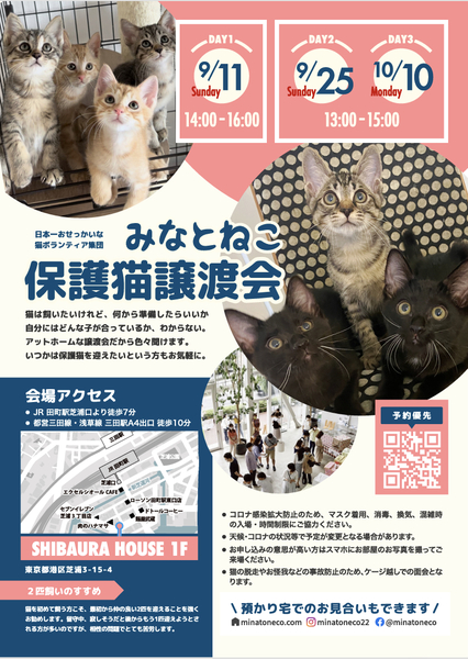 | イベント内容 | 2021年も250匹もの猫と里親さんのご縁を繋いだ毎月定期開催している譲渡会です。 なるべくゆっくりご相談など承れるよう、また、新型コロナの感染拡大防止の観点から予約優先、混雑時は入場をお待ちいただいたり、マスクの着用と消毒のご協力をお願いしております。換気のためにドアをオープンしての開催のためにケージ越しでのご対面となりますことご理解ください。 みなとねこは現在地方の協力ボランティアさんの元にいる子猫も合わせると今年生まれの子猫が110匹おります。 譲渡会には20ケージ 40匹ほどの参加となりますが、預かり宅の子猫もご紹介可能です。 みなとねこは子猫は2匹ペアでの譲渡が原則です。 初めての方こそ最初から2匹をお勧めしています。 また私たちボランティアはご縁のあった猫たちに終生里親様に愛されて幸せに安全に暮らして欲しいと願っています。 このため里親になっていただくにはいくつかの条件やお約束事があります。 ■里親申込 事前誓約書 adobe.ly/35jdcb2 会場では申込書とお部屋のお写真を拝見してお迎えまでにご準備いただきたいことなどご説明します。 ■里親申込書 adobe.ly/2HqP1iI 会場にてご記入いただくことも可能ですが、お手元で印刷可能でしたら、ご記入の上ご来場いただくことをおすすめしております。 ※事前誓約書の3と4に該当がある方は是非事前にご相談ください。 また猫それぞれの月齢や保護主の考えにより、譲渡条件が加わる場合があります。 実際の参加予定猫は9/10(土)21:00までにみなとねこのHPやFacebookページでご紹介します。 直接ご応募の方は詳細をLINEなどでやりとりの上で預かり宅でのお見合いも行っております。 そうした中で譲渡会前に里親様が決定することもございますことご了承ください。 https://m.facebook.com/minatoneco/ 譲渡会のご予約は8/28(日)21:00よりみなとねこのHPよりお願いします http://www.minatoneco.com |