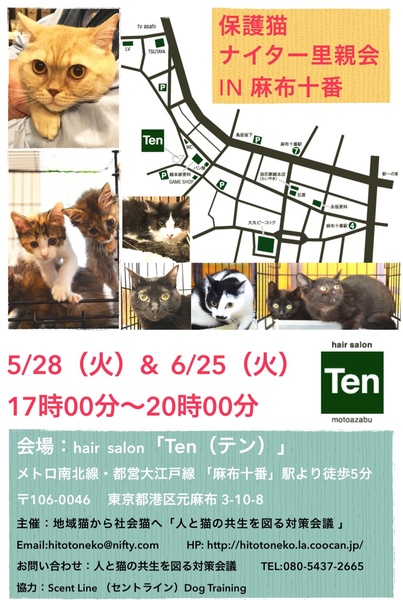 | イベント内容 | FIPフリー:全頭FIP血液検査を実施。陽性の子と陰性の子は隔離、猫たちは最高の環境の中にいます。 コロナウィルス抗体価100未満陰性の子のみ里親会に参加。 また、お問い合せの前にお願い事項の確認をお願いします。 http://homepage2.nifty.com/hitotoneko/keiyaku.html 4箇月齢以下の子猫は、 2頭一組または同世代の先住子猫がいる方、 お留守番時間が8時間以下の方 に限ってお譲りします。 成猫については、お留守番時間についての制限は特にございません。 猫又は犬を4頭以上飼っている方にはお譲りできません。 55歳以上の方には、子猫はお譲り出来ません。 60歳の方は5歳、65歳の方なら10歳の成猫ならお譲りできます。 お試し期間は1週間です。 お申し込み時に、運転免許証、健康保険証など、 身分を保証する証明証の提示をお願いします。 猫が欲しい。猫を飼ってみたい。 猫に不妊・去勢手術を受けさせたい。 猫のボランティアをやってみたい その他、猫の相談よろず引き受けます。 一緒にボランティアをやってみませんか。会員募集中! 港区、新宿区のシェルターの猫のお世話係 週1回、2時間程度、時間帯は自由 学生には交通費として1000円を一律に支給します。 他に、TNRボランティア、搬送ボランティアなどを募集しています。 まずはお気軽に体験作業にお越し下さい。 主催 地域猫から社会猫へ・猫の生きる権利確認連絡協議会 電話 080-5437-2665 メールアドレス hitotoneko@ezweb.ne.jp ホームページ http://hitotoneko.la.coocan.jp |