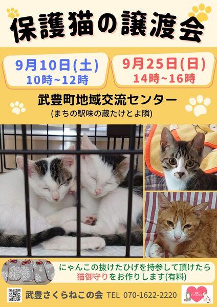 | イベント内容 | 私たちの団体が保護している猫達の譲渡会を開催します。猫をお迎えしようと考えておられる方は是非見に来てください。かわいい猫が待っています。 | ||