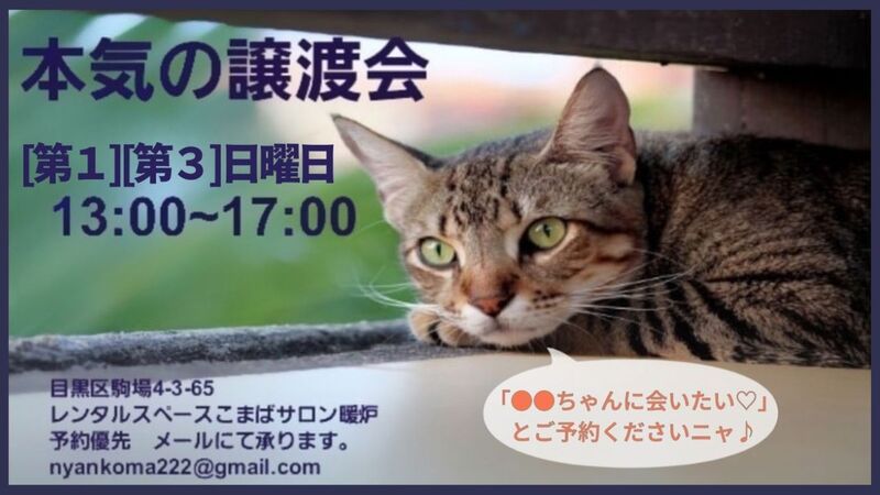 | イベント内容 | こまばサロン暖炉 〜本気の譲渡会〜 1時間交代の予約優先制 今回は多数の保護猫がいる時期にあたり、臨時特別開催です‼ 会いたい子がいる場合には、ぜひご予約の際にお伝えください♪ 複数の猫をご希望いただいてもOK♪ 子猫、成猫、キジトラなどざっくりした希望でもかまいません。 ※必ず主催者様のFBやInstagramをご確認ください。 ※事前予約でお声のかからなかった猫は、当日参加しない可能性があります。 [主催] 保護猫譲渡会カフェ こまばサロン暖炉 [FBページ] https://www.facebook.com/nyankomaba [Instagram] https://www.instagram.com/komaba.neko/ 【予約方法】主催者様宛メール予約 nyankoma222@gmail.com ●お名前 ●人数 ●会いたい猫の名前 ●時間(①13:00~ ②14:00~ ③15:00~ ④16:00~) 上記をご記入のうえご予約ください。 【会場】 東京都目黒区駒場4-3-65 レンタルスペースこまばサロン暖炉 ※最寄駅:駒場東大前駅 徒歩8分 |