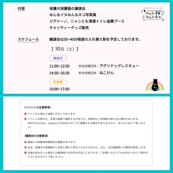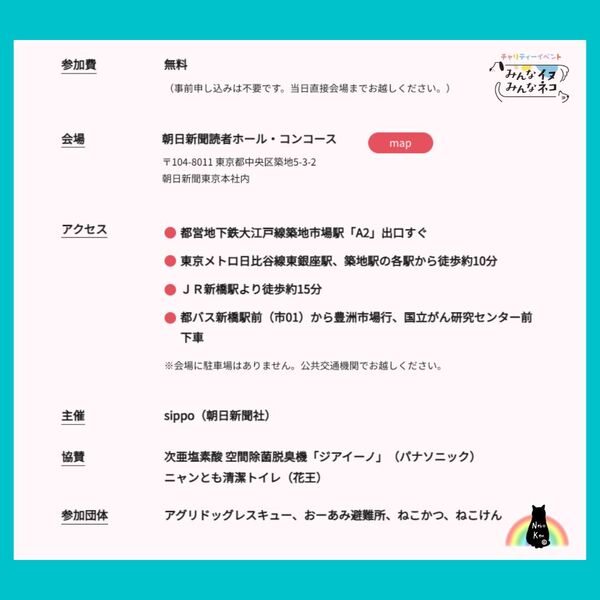 | イベント内容 | チャリティーイベント 『みんなイヌみんなネコ』の保護犬保護猫の譲渡会に参加します!! https://sippo.asahi.com/minnainu_minnaneko/ 2022年9月10日(土) 14:30~16:30 譲渡会は30~40分程度の入れ替え制を予定しております。 可愛い可愛いねこけん保護猫たちが大集結いたしますので、ぜひ会いに来てください♪ 他にも ・みんなイヌみんなネコ写真展 ・ジアイーノ、ニャンとも清潔トイレ協賛ブース ・チャリティーグッズ販売 など様々なイベントを同時開催しておりますので、どうぞお楽しみくださいね♪ 同日の午前中は 11:00~12:50 アグリドッグレスキュー様の保護犬譲渡会が開催されております。 また翌日9月11日(日)には午前午後ともに保護猫譲渡会開催。 11:00~12:50 おーあみ避難所様 14:30~16:30 ねこかつ様 ----- 【参加費】 無料 (事前申し込みは不要です。当日直接会場までお越しください。) 【会場】 朝日新聞読者ホール・コンコース 〒104-8011 東京都中央区築地5-3-2 朝日新聞東京本社内 【アクセス】 都営地下鉄大江戸線築地市場駅「A2」出口すぐ 東京メトロ日比谷線東銀座駅、築地駅の各駅から徒歩約10分 JR新橋駅より徒歩約15分 都バス新橋駅前(市01)から豊洲市場行、国立がん研究センター前下車 ※会場に駐車場はありません。公共交通機関でお越しください。 【主催】 sippo(朝日新聞社) 【協賛】 次亜塩素酸 空間除菌脱臭機「ジアイーノ」(パナソニック) ニャンとも清潔トイレ(花王) ----- [お問い合わせ] メールアドレス nekoken@cat.email.ne.jp ねこけんHPお問い合わせフォーム https://nekoken.jp/inquiry/ いつでも里親募集中 掲載猫ちゃん https://satoya-boshu.net/foster/?@button_name@=search&FosterParent_MemberID=1288&StatusID=2 ----- ペットとしてではなく、生涯家族として猫を迎えて下さる方への譲渡となります。 ◆必ずお守り頂く事◆ ①終生飼養 ②完全室内飼養 ③年1回のご報告 ④ペット飼育可能な物件にお住まいであること 不妊去勢手術・医療費の一部負担をお願いしております。 ※お届けエリアによっては掲載の譲渡費用とは別途、往復高速料金(実費)をご負担いただく場合がございます。 ご希望の猫さんと家族になるまでの流れや、譲渡時にかかる一部ご負担金などの詳細、契約書のサンプルも含め下記URLに掲載しております。ご確認ください。 http://nekoken.jp/jotokai/joto-nagare/ https://nekoken.jp/jotokai/joutokibou/ なお、譲渡対象エリアは東京近郊(東京都・神奈川県・埼玉県・千葉県)に限らせていただきます。 対象エリア内であっても、遠方の場合アフターフォローの関係上お断りさせていただく場合もございますのでご了承ください。 |
