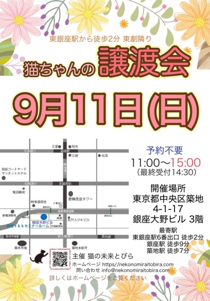 | イベント内容 | 恵まれない環境にいる猫たちが未来へのとびらを開いて幸せなご縁に繋がる橋渡しをしていきます。 たくさんの猫ちゃんと保護主・スタッフ一同みなさまのご来場を心よりお待ちしています! 子猫ちゃん〜成猫ちゃんまで参加します♪ ※ご来場頂く方と私たち保護主、スタッフの安心と安全の為、感染リスクを限りなく低減させる為、私たちが出来うる対策をしてお待ちしております※ 【ご来場いただく皆様には下記についてお願い致します】 ★不織布マスクの着用をお願い致します。 (マスク着用のない方は入場出来ません) ★譲渡会場にお入り頂く前に検温・手洗いと手の消毒、検温をお願い致します。 ★ソーシャル・ディスタンス(人と人との間隔を開ける)をお願い致します。 ★熱のある方や体調の優れない方は譲渡会への来場を見合わせて頂けますよう、お願い致します。 ★来場者数によりましては人数制限もありますので長時間お待たせてする場合もございます。 予めご了承下さい。 コロナウイルス感染拡大防止の為、このような厳しいお願いで大変恐縮ですが何卒ご理解とご協力、ご了承をいただけますようお願い致します。 ★☆★★☆★★☆★★☆★★☆★★☆★★☆★★☆★★☆★ ★開催日時 2022年9月11日(日) 11:00~15:00 (最終受付 14:30) ★会場 東京都中央区築地4-1-17 銀座大野ビル 3階 (東劇となり) ★最寄駅 東銀座駅 6番出口 徒歩2分 銀座駅 徒歩9分 ・築地駅 徒歩7分 駐車場は当ビル又は近隣のコインパーキング等をご利用ください。 会場への直接のお問い合わせはご遠慮くださいませ。 ★☆★★☆★★☆★★☆★★☆★★☆★★☆★★☆★★☆★ 会場で猫ちゃんと触れ合ってご縁を繋いでください。 里親様・猫ちゃんが双方、幸せな家族になれるよう保護主・スタッフがサポート致します。 ご不安な事はお気軽にご相談ください。 入場無料です。事前のご予約は不要です。 当日猫ちゃんの引き渡しはございません。 後日、保護主が里親様宅へお届けいたします。 ※参加予定猫ちゃんは、急な体調不良等で不参加になる場合もございます。 開催当日の朝、当会ブログにて不参加の最新情報を掲載致しますのでご確認をお願い申し上げます。 ◇譲渡に関してのお願い・基本条件 1.家族の一員として終生最期まで愛育下さい。 2.完全室内飼い・ペット可のお住まい(契約書を拝見致します) 3.脱走防止対策 4.避妊・去勢手術 5.里親様のご自宅へのお届け 6.譲渡誓約書への署名捺印・身分証明書の提示 7.医療費譲渡金のご負担 8.定期報告 9.トライアル期間有り ※保護主により譲渡条件は異なりますので会場で直接ご相談ください。 60才以上の方のみのご家庭、未成年の方、単身の方、同棲中の方、 小学生低学年以下のお子様のいる方、必要な脱走対策を施していただけない方は 譲渡をご遠慮頂く場合もございますのでご了承ください。 仔猫の場合は主にお世話される方のご年齢は55歳までとさせて頂きます。 オーバーする方はご相談くださいませ。 小さな子猫の譲渡は体重が1kgになってからのお届けやお留守番の無い(少ない)ご家庭を希望いたします。 医療費譲渡金に関しましては詳しくはホームページの 【譲渡に関してのお願い】【譲渡の流れ】をご覧くださいませ。 ~主催 猫の未来とびら~ |