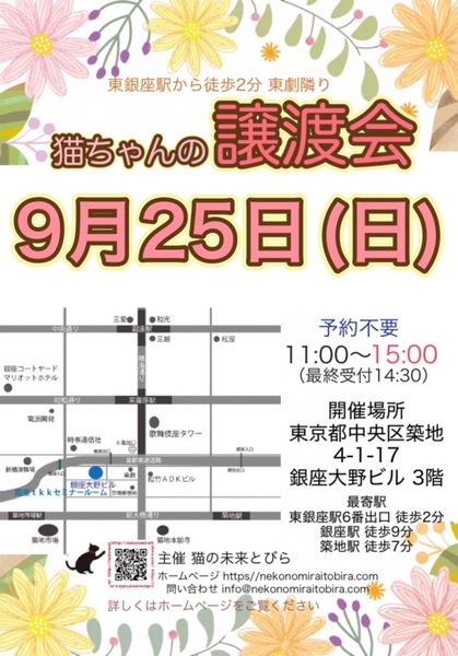 | イベント内容 | 恵まれない環境にいる猫たちが未来へのとびらを開いて幸せなご縁に繋がる橋渡しをしていきます。 たくさんの猫ちゃんと保護主・スタッフ一同みなさまのご来場を心よりお待ちしています! 子猫ちゃん〜成猫ちゃんまで参加します♪ ※ご来場頂く方と私たち保護主、スタッフの安心と安全の為、感染リスクを限りなく低減させる為、私たちが出来うる対策をしてお待ちしております※ 【ご来場いただく皆様には下記についてお願い致します】 ★不織布マスクの着用をお願い致します。 (マスク着用のない方は入場出来ません) ★譲渡会場にお入り頂く前に検温・手洗いと手の消毒、検温をお願い致します。 ★ソーシャル・ディスタンス(人と人との間隔を開ける)をお願い致します。 ★熱のある方や体調の優れない方は譲渡会への来場を見合わせて頂けますよう、お願い致します。 ★来場者数によりましては人数制限もありますので長時間お待たせてする場合もございます。 予めご了承下さい。 コロナウイルス感染拡大防止の為、このような厳しいお願いで大変恐縮ですが何卒ご理解とご協力、ご了承をいただけますようお願い致します。 ★☆★★☆★★☆★★☆★★☆★★☆★★☆★★☆★★☆★ ★開催日時 2022年9月25日(日) 11:00~15:00 (最終受付 14:30) ★会場 東京都中央区築地4-1-17 銀座大野ビル 3階 (東劇となり) ★最寄駅 東銀座駅 6番出口 徒歩2分 銀座駅 徒歩9分 ・築地駅 徒歩7分 駐車場は当ビル又は近隣のコインパーキング等をご利用ください。 会場への直接のお問い合わせはご遠慮くださいませ。 ★☆★★☆★★☆★★☆★★☆★★☆★★☆★★☆★★☆★ 会場で猫ちゃんと触れ合ってご縁を繋いでください。 里親様・猫ちゃんが双方、幸せな家族になれるよう保護主・スタッフがサポート致します。 ご不安な事はお気軽にご相談ください。 入場無料です。事前のご予約は不要です。 当日猫ちゃんの引き渡しはございません。 後日、保護主が里親様宅へお届けいたします。 ※参加予定猫ちゃんは、急な体調不良等で不参加になる場合もございます。 開催当日の朝、当会ブログにて不参加の最新情報を掲載致しますのでご確認をお願い申し上げます。 ◇譲渡に関してのお願い・基本条件 1.家族の一員として終生最期まで愛育下さい。 2.完全室内飼い・ペット可のお住まい(契約書を拝見致します) 3.脱走防止対策 4.避妊・去勢手術 5.里親様のご自宅へのお届け 6.譲渡誓約書への署名捺印・身分証明書の提示 7.医療費譲渡金のご負担 8.定期報告 9.トライアル期間有り ※保護主により譲渡条件は異なりますので会場で直接ご相談ください。 60才以上の方のみのご家庭、未成年の方、単身の方、同棲中の方、 小学生低学年以下のお子様のいる方、必要な脱走対策を施していただけない方は 譲渡をご遠慮頂く場合もございますのでご了承ください。 仔猫の場合は主にお世話される方のご年齢は55歳までとさせて頂きます。 オーバーする方はご相談くださいませ。 小さな子猫の譲渡は体重が1kgになってからのお届けやお留守番の無い(少ない)ご家庭を希望いたします。 医療費譲渡金に関しましては詳しくはホームページの 【譲渡に関してのお願い】【譲渡の流れ】をご覧くださいませ。 ~主催 猫の未来とびら~ |