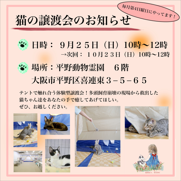 | イベント内容 | 9月25日(日)に大阪市で猫の譲渡会を開催します! 多頭飼育崩壊から救出した猫ちゃんをあなたの手で癒してあげてほしいです。 子猫、おとな猫などたくさんの猫ちゃん達が参加します。 テントの中で気になる猫ちゃんと遊んでみよう! 日時:2022年9月25日(日) 10:00〜12:00 →毎月第4日曜日にやってます。次回は10月23日(日)です。 場所:平野動物霊園 6階 住所:大阪市平野区喜連東3−5−65 ※施設の駐車場は使えません。近隣の有料駐車場をお使いいただければと思います。 有料駐車場は1F受付で案内いたします。 【電車でお越しの場合】 Oaka Metro谷町線「喜連瓜破」駅、3番出口を出て東(左)に徒歩9分。 Oaka Metro谷町線「出戸」駅、1番出口を出て西(左)徒歩7分。 【バスでお越しの場合】 「Oaka Metro長居」発「出戸バスターミナル」行き乗車「喜連住宅前」下車、 西へ徒歩5分(左)徒歩7分。 【車でお越しの場合】 阪神高速14号松原線「喜連瓜破」出口より長居公園通東へ約2分。 |