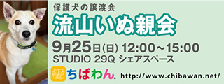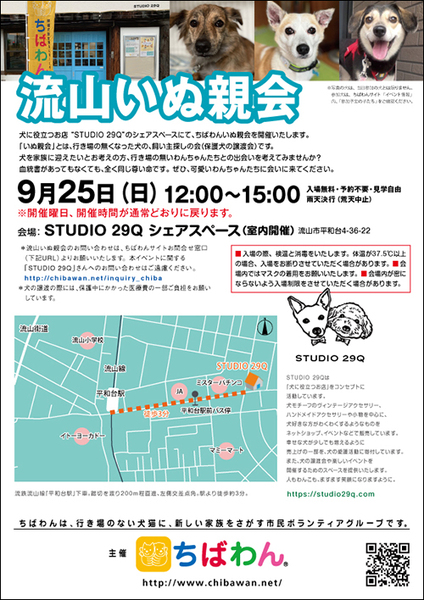 | イベント内容 | “STUDIO 29Q”にて第14回 流山いぬ親会を開催いたします。 毎日暑いですね。9月の流山いぬ親会は、ご来場の皆様、参加の犬達の体への負担を考えて、土曜日の夕方開催とします。いつもと、開催曜日、開催時間が異なりますので、ご注意ください。 夏休みの夕方、ちばわんの犬達に会いに来てみませんか。 【感染予防のため、ちばわんからのお願い】 ①会場内ではマスクの着用をお願いします。 ②入場の際、検温と消毒をお願いします。体温が37.5℃以上の場合、入場をお断りさせていただく場合があります。 ③密を避けるために、入場者数および入場時間の制限をする場合があります。また、入場制限の結果、入場をお断りさせていただく場合があります。 ※いぬ親会見学は予約等必要ありません。無料でどなたでも入場できます。ただし、感染予防のために入場をお断りさせていただく場合があります。 ※ネットによる募集も平行して行っているため、参加予定の犬が当日までに決定・不参加となる場合もあります。 ※イベントバナーに写真が掲載されている犬が参加するとは限りません。参加犬は本サイトに順次掲載されますのでそちらをご確認ください。 開催日:9月25日(土)12:00~15:00 ※開催曜日、開催時間がいつもと異なります。ご注意ください。 室内開催:雨天決行 (荒天中止) 場所:STUDIO 29Q シェアスペース(2階) 千葉県流山市平和台4-36-22 【会場アクセス】 流鉄流山線「平和台駅」下車。踏切を渡り200m程直進、左側交差点角。駅より徒歩約3分。 駐車場はございません。当日お車の方は近隣のコインパーキングをご利用ください。 【注意事項】 《ご来場される皆様へのお願い》 臆病な性格の犬や、子供さんを苦手とする犬も参加しています。いきなり触ったりせず、まずボランティアに声をかけてください。 お子様と一緒にご来場される際には、手を繋ぐなどして頂き、お子様だけで参加犬に近づくことのないようご注意ください。 会場に同伴される犬には、必ずリード(引き綱)をつけてください。 【当日の流れ】 (1)家族募集中のいぬとお会いになりたい方はどなたでもご参加いただくことができます。ちばわんボランティアは名札をつけておりますので、ご遠慮なくお声をかけて下さい。また、募集中のいぬのそばには預かりボランティアが控えておりますのでいぬの性格や生活習慣など、遠慮なくご質問ください。 (2)ご希望のいぬが決まったら、お申し込みアンケートにご記入の上、ボランティアにお渡し下さい(前日までにメールでアンケートを送信してお申し込みいただくこともできます。) ◆「いぬ」アンケート送信先:https://chibawan.net/contactform_dog (3)アンケート内容を拝見し、お話させていただきます。 (4)原則として3日以内にお返事の連絡をさせていただきます。 (5)ご縁が成立した場合には、後日、こちらからご自宅までいぬをお届けし、約1ヶ月のお試し生活に入っていただきます。お届けの際に、書面での譲渡契約書を交わします。 ※ワクチン・不妊手術代など保護犬にかかった費用は、家族になるいぬ親さんにもご負担をお願いしています 【お知らせ】 ◆会場ではチャリティグッズを販売します 【お問い合わせ】 いぬ親会について:https://chibawan.net/inquiry_chiba ※いぬ親会当日はメールが見れません。また、お問い合わせの際は、必ず「具体的な件名」を入れて多数の迷惑メールと区別がつくようにお願いいたします。 流山いぬ親会イベントホームページ https://chibawan.net/event/20220925-nagareyama-dog ちばわんホームページ https://chibawan.net/ |