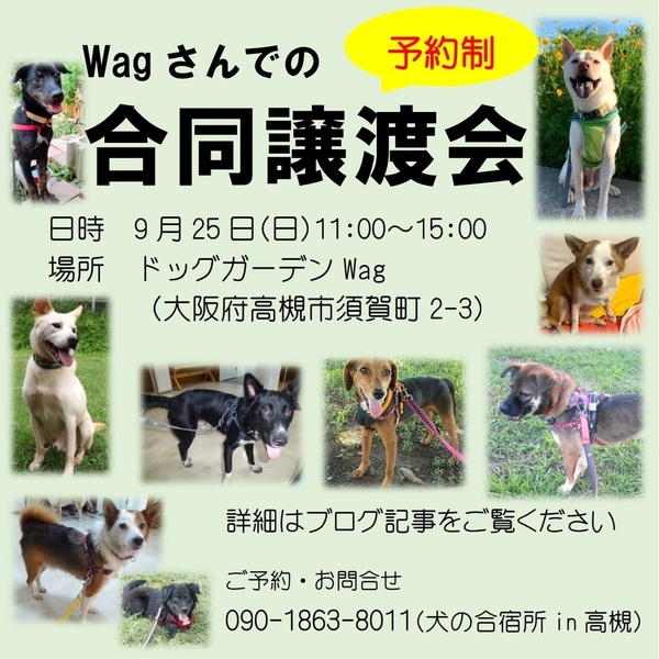 | イベント内容 | 9/25 ドッグガーデンwagさんとの合同譲渡会を開催します。 参加犬や詳細については、近づきましたら犬の合宿所in高槻のブログで紹介いたします。 参加犬については、ぎりぎりまで変更等があります。 電話でお問い合わせください➡090-1863-8011 ●感染症対策のため、予約制にさせて頂きます。 電話での事前予約をお願いします。➡090-1863-8011 ●先住犬を連れてきて頂けますが、前もってご連絡ください。 ●マスク着用をお願いいたします。 ●お見合い希望がなければ 参加しない犬もいます。 また、予約状況によっては、部分参加の犬もいます。 ご来場予定の方は必ず電話でご連絡ください。➡090-1863-8011 |