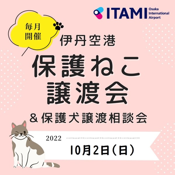 | イベント内容 | 伊丹空港✈保護ねこ譲渡会 https://ameblo.jp/kuukojotokai/ 【日時】2022年10月2日(日) 13:00~16:00 【場所】伊丹空港(大阪空港) 北ターミナル4F「星の間」 ※駐車場あり(30分以内無料、以降30分/\150) 【参加条件等】 保護猫譲渡会への入場には整理券が必要です。12:00から「星の間」にて配布いたします。 ☆空港と保護ねこの異色のコラボが実現! 新しい家族を待っている、たくさんの可愛いねこちゃん達が、 大阪国際空港(伊丹空港)に集まります! ぜひご家族で、展望デッキから飛行機を見て、美味しいグルメでお腹を満たし、 可愛いねこちゃん達に癒されて、楽しい1日をお過ごし下さい。 ☆同時開催(こちらにご参加の方は整理券なしでご入場頂けます) 【保護犬里親募集相談会】写真による保護犬の里親募集です。 【チャリティーグッズ販売会】利益はすべて猫を救う活動に使います。 【ドネーションビン設置】ご自宅で使わなくなったペットフードや、 ペットグッズの寄付を受付けます。ご協力お願い致します。(未使用品に限る) 主催:teamねこのて 協力:関西エアポート株式会社 問合せ:kaizaru7★yahoo.co.jp (★を@に変えて下さい) |