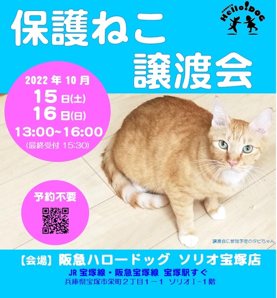 | イベント内容 | 保護ねこ譲渡会 at 阪急ハロードッグ宝塚 https://ameblo.jp/takarazuka-tnr/ 様々な理由で行き場を失った猫達が、家族との出会いを心待ちにしています。 阪急ハロードッグ CAT FESTIVALとのコラボ開催です。 皆様のお越しをお待ちしています。 【日時】 2022年10月15日(土) ・16日(日) 各日とも13:00~16:00(最終受付15:30) 【場所】 阪急ハロードッグ・ソリオ宝塚店内 阪急宝塚駅直結 ・ JR宝塚駅 徒歩2分 【予約不要】 直接会場へお越し下さい。 【ご注意事項】 必ずご一読下さい。 ※ 譲渡は先着順ではありません! 2日間ですべての方の見学が終わってから猫達にいちばん合う里親様を決定させて頂きます。 ※13時~14時はかなり込み合います。先着順ではないので時間をずらして来場下さい。 【主催】 特定非営利活動法人 TNR宝塚 【協力】 阪急ハロードッグ ソリオ宝塚店/ペットアダプションセンター宝塚 【後援】 宝塚市 |