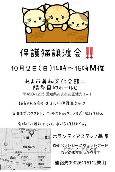 | イベント内容 | 沢山の保護猫達と、沢山の保護主が、素敵なご家族に巡り出会えます様に✨✨✨ 猫を参加させる保護主さんは、当日までに、ウィルスチェック、ノミダニ駆除、ワクチンを終え、手ぶらで会場にお越し下さい✨猫を忘れずに(笑)よろしくお願いします! |