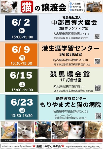 | イベント内容 | =みなと猫の会 第199回譲渡会のお知らせ== 新しい家族を待つ猫たちに 会いに来ませんか? ◆ペットショップへ行く前にぜひ譲渡会へ◆ トイレトレーニングや 基本的な健康診断を終わらせた 生後2ヶ月~9才くらいの 猫たちが大集合! ○主 催 みなと猫の会 ○日 時 2019年6月15日(土)13:00~15:00 ○場 所 競馬場会館 1F打合せ室 愛知県名古屋市港区泰明町1-1 あおなみ線「名古屋競馬場前」駅より徒歩3分 ※大型無料駐車場有 https://goo.gl/maps/rCtj7cmRKTL2 ○参加猫について ・参加している猫は、ワクチンや駆虫等の基本治療を済ませています。 また、年齢に応じて避妊去勢手術を行っています。 ・参加予定猫が体調不良などで急遽不参加になることもあります。 ○ご来場の皆様へ ・譲渡会の見学は入場無料・予約不要です。 ・当日に猫をお渡しすることはありません。 後日ご自宅までお届けに伺います。 ・一週間から二週間のトライアル期間後、正式譲渡となります。 ・トライアル及び譲渡の際には 完全室内飼い・ご家族の同意・脱走防止策・ アンケート記入など諸条件がございます。 ・里親様には治療費の一部ご負担をお願いしております。 これ以上不幸な猫を増やさないための 治療費とさせて頂きますので何卒ご理解ください。 ・非会員の個人保護者も参加しています。 譲渡条件やトライアルは猫の保護者に準じます。 ・譲渡会の流れ http://minatoneko2014.blog.fc2.com/blog-entry-11.html ○参加猫情報は随時更新中! ↓↓参加猫一覧↓↓ http://minatoneko2014.blog.fc2.com/blog-entry-493.html ○猫に関する相談も受け付けています ねこについての困りごと、トラブルなどを抱えている方、 相談へいらっしゃいませんか。 ○次回以降の譲渡会予定 日時:6月23日(日)13時30分~ 場所:動物医療センター もりやま犬と猫の病院 愛知県名古屋市守山区深沢2-101 ゆとりーとライン「志段味西小学校」バス停留所 徒歩2分 ◎主催者ブログ みなと猫の会 ~こぴっと猫だより~ http://minatoneko2014.blog.fc2.com/ ◎参加者のブログ myままさんブログ「にゃんこの宝箱」 http://wagayamama.cocolog-nifty.com/jiru/ 犬白ママさんブログ「犬白日記」 http://k531.blog25.fc2.com/ uzumakinecoさんブログ「猫ときどき雨」 http://uzumakineco.blogspot.jp/ sion1226さんブログ「さとおやさがし」 http://sion1226.blog.fc2.com/blog-entry-1.html ■上記ブログに会ってみたい猫がいた!でも参加予定猫に入ってない、 どうすればいいの? ■譲渡会当日は都合が悪くて… それ以外の日に猫とお見合いがしたい! などのお問い合わせは minatonekonokai@gmail.com まで 写真1枚目 お姉ちゃん ♀ 1~2才 控え目で大人しい女の子 小柄なので抱っこも軽々♪ 写真2枚目 ゴン ♂ 4才 ビビリんちょの怖がりさんですが心優しく温厚です ☆★個性豊かな猫たちが皆様をお迎えします★☆ 猫とスタッフ一同、お待ちしております。 |