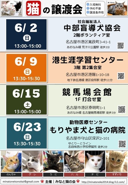 | イベント内容 | =みなと猫の会 第200回譲渡会のお知らせ== 新しい家族を待つ猫たちに 会いに来ませんか? ◆ペットショップへ行く前にぜひ譲渡会へ◆ トイレトレーニングや 基本的な健康診断を終わらせた 生後2ヶ月~9才くらいの 猫たちが大集合! ○主 催 みなと猫の会 ○日 時 6月23日(日)13:30~15:30 ○場 所 動物医療センター もりやま犬と猫の病院 名古屋市守山区深沢2-101 ゆとりーとライン 志段味西小学校バス停留所 徒歩2分 https://goo.gl/maps/oPzQu3PWqE32 ※車でお越しの場合は 病院第2駐車場をご利用ください ※お問い合わせは会場ではなく minatonekonokai@gmail.comまで ○参加猫について ・参加している猫は、ワクチンや駆虫等の基本治療を済ませています。 また、年齢に応じて避妊去勢手術を行っています。 ・参加予定猫が体調不良などで急遽不参加になることもあります。 ○ご来場の皆様へ ・譲渡会の見学は入場無料・予約不要です。 ・当日に猫をお渡しすることはありません。 後日ご自宅までお届けに伺います。 ・一週間から二週間のトライアル期間後、正式譲渡となります。 ・トライアル及び譲渡の際には 完全室内飼い・ご家族の同意・脱走防止策・ アンケート記入など諸条件がございます。 ・里親様には治療費の一部ご負担をお願いしております。 これ以上不幸な猫を増やさないための 治療費とさせて頂きますので何卒ご理解ください。 ・非会員の個人保護者も参加しています。 譲渡条件やトライアルは猫の保護者に準じます。 ・譲渡会の流れ http://minatoneko2014.blog.fc2.com/blog-entry-11.html ○参加猫情報は随時更新中! ↓↓参加猫一覧↓↓ http://minatoneko2014.blog.fc2.com/blog-entry-493.html ○猫に関する相談も受け付けています ねこについての困りごと、トラブルなどを抱えている方、 相談へいらっしゃいませんか。 ○次回以降の譲渡会予定 近日告知予定 ◎主催者ブログ みなと猫の会 ~こぴっと猫だより~ http://minatoneko2014.blog.fc2.com/ ◎参加者のブログ myままさんブログ「にゃんこの宝箱」 http://wagayamama.cocolog-nifty.com/jiru/ 犬白ママさんブログ「犬白日記」 http://k531.blog25.fc2.com/ uzumakinecoさんブログ「猫ときどき雨」 http://uzumakineco.blogspot.jp/ sion1226さんブログ「さとおやさがし」 http://sion1226.blog.fc2.com/blog-entry-1.html ■上記ブログに会ってみたい猫がいた!でも参加予定猫に入ってない、 どうすればいいの? ■譲渡会当日は都合が悪くて… それ以外の日に猫とお見合いがしたい! などのお問い合わせは minatonekonokai@gmail.com まで 写真1枚目 みどり ♂ 2ヶ月 人見知りゼロ!初めて会った人のお膝の上でもお昼寝しちゃいます♪ 写真2枚目 レモン ♀ 2ヶ月 元気いっぱいな甘えん坊 肩やお膝に乗ってきてスリスリしてきます ☆★個性豊かな猫たちが皆様をお迎えします★☆ 猫とスタッフ一同、お待ちしております。 |