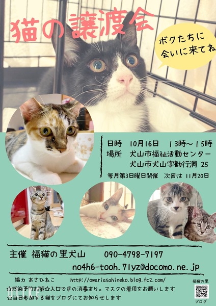 | イベント内容 | 【ココがポイント!】 ★ウイルスチェックなど健康診断済み! 20匹ほど参加予定です。 【日時】 10月16日 (日) 13~15時 【場所】 犬山市福祉活動センター (犬山市大字犬山字勧行洞25) 予約不要 広々駐車場あり 福猫の里 犬山「福猫の里便り」 https://hukunekonosato.hatenablog.com/ 問い合わせ先(福猫の里 犬山) a-saoka.922@outlook.com 協力 あさひねこ http://owariasahineko.blog.fc2.com/ ーーーーーーーーーーーー 【感染予防対策】 ★入口で検温と手の消毒あり ★マスクの着用をお願いします ★入場制限する場合があります ★猫と猫の間をあけます。 ★保護主との距離も取ります ★定期的に換気をします 【お約束】 当日、会場での猫の引き渡しはしておりません。 後日ご自宅までお届けします。 お試し飼育(トライアル)を1週間して頂き、双方が納得の上で正式譲渡となります。 譲渡の際は、医療費の一部の負担をお願いしております。(ワクチン代 等) ・ペット可のお住まい ・完全室内飼育、終生飼育 ・適切な医療措置 ・不妊手術の実施と報告等、お約束があります。 |