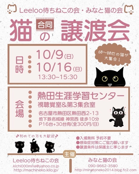 | イベント内容 | =みなと猫の会 第353回譲渡会のお知らせ== ▶Leeloo待ちねこの会さんと合同で開催いたします 子猫もおとな猫もいますよ~~ ◆ペットショップへ行く前にぜひ譲渡会へ◆ 完全室内暮らしのトレーニングを済ませた猫たちがやってきます ○主 催 Leeloo待ちねこの会・みなと猫の会 ○日 時 2022年10月16日(日) 13:30~15:30 ○場 所 熱田生涯学習センター 視聴覚室&第3集会室 愛知県名古屋市熱田区熱田西町2-13 地下鉄名城線「神宮西」駅 徒歩12分 ※駐車場有(専用16台 利用料:300円/日) ※↓近隣コインパーキング https://goo.gl/maps/vKXTbdjBafzi2NAs7 ※お問い合わせは会場ではなく minatonekonokai@gmail.comもしくは 090-9662-3580 まで ○参加猫について ・参加している猫は、ワクチンや駆虫等の基本治療を済ませています。 また、年齢に応じて避妊去勢手術を行っています。 ・参加予定猫が体調不良などで急遽不参加になることもあります。 ○参加猫一覧 http://minatoneko2014.blog.fc2.com/blog-entry-1676.html ○ご来場の皆様へ ・譲渡会の見学は入場無料・予約不要です。 ・当日に猫をお渡しすることはありません。 後日ご自宅までお届けに伺います。 ・一週間から二週間のトライアル期間後、正式譲渡となります。 ・トライアル及び譲渡の際には 完全室内飼い・ご家族の同意・脱走防止策・ アンケート記入など諸条件がございます。 ・里親様には治療費の一部ご負担をお願いしております。 これ以上不幸な猫を増やさないための 治療費とさせて頂きますので何卒ご理解ください。 ・非会員の個人保護者も参加しています。 譲渡条件やトライアルは猫の保護者に準じます。 ・譲渡会の流れ http://minatoneko2014.blog.fc2.com/blog-entry-11.html ○参加猫情報は随時更新中! http://minatoneko2014.blog.fc2.com/blog-entry-493.html ○猫に関する相談も受け付けています ねこについての困りごと、トラブルなどを抱えている方、 相談へいらっしゃいませんか。 ○次回以降の譲渡会予定 日時:10月23日(日) 13:30-15:30 場所:動物医療センター もりやま犬と猫の病院 新館2階 会議室 愛知県名古屋市守山区深沢2-101 ゆとりーとライン「志段味西小学校」バス停留所 徒歩2分 日時:10月30日(日) 13:30-15:30 場所:熱田生涯学習センター 2階 第3集会室 名古屋市熱田区熱田西町2-13 地下鉄名城線「神宮西」駅より徒歩12分 日時:11月6日(日) 13:30-15:30 場所:港生涯学習センター 3階 視聴覚室 名古屋市港区港陽1-10-18 地下鉄名港線「港区役所」駅より徒歩10分 日時:11月13日(日) 13:30-15:30 場所:熱田生涯学習センター 2階 第3集会室 名古屋市熱田区熱田西町2-13 地下鉄名城線「神宮西」駅より徒歩12分 日時:11月20日(日) 13:30-15:30 場所:熱田生涯学習センター 2階 第3集会室 名古屋市熱田区熱田西町2-13 地下鉄名城線「神宮西」駅より徒歩12分 日時:11月27日(日) 13:30-15:30 場所:動物医療センター もりやま犬と猫の病院 新館2階 会議室 愛知県名古屋市守山区深沢2-101 ゆとりーとライン「志段味西小学校」バス停留所 徒歩2分 ◎主催者ブログ ・Leeloo待ちねこの会 http://machineko.kilo.jp/ ・みなと猫の会 ~こぴっと猫だより~ http://minatoneko2014.blog.fc2.com/ ■上記ブログに会ってみたい猫がいた!でも参加予定猫に入ってない、 どうすればいいの? ■譲渡会当日は都合が悪くて… それ以外の日に猫とお見合いがしたい! などのお問い合わせは minatonekonokai@gmail.com まで 〇感染症の拡大防止にご協力願います ・会場入出時の手の消毒にご協力ください ・定期的に換気作業を行います ・マスク等の使用をお願いします ☆★個性豊かな猫たちが皆様をお迎えします★☆ 猫とスタッフ一同、お待ちしております |