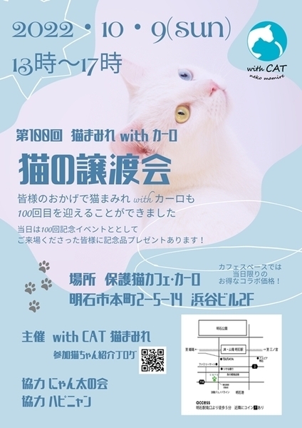| イベント内容 | 猫の譲渡会 第100回目 (100回記念ご来場者様全員記念品プレゼント♪) 日時:10月9日(日)13時から17時まで 場所:明石市本町2-5-14 浜谷ビル2階 保護猫カフェ・カーロ (お問合せはカーロさんにしないようにお願いします) 子猫がたくさん参加しています♪ 本気で猫を飼いたい方是非ご来場ください 早い順ではございませんが早くに決まってしまう場合がございますので お早めにお越しいただくか面会予約をお願いします ※無料ではありません ※当日連れて帰れません ※譲渡条件があります ●参加猫たちのお紹介やお問い合わせ(面会予約等)は ブログよりご連絡お願いします https://mycatkobe.blog.fc2.com/ 主催:with CAT 猫まみれ |