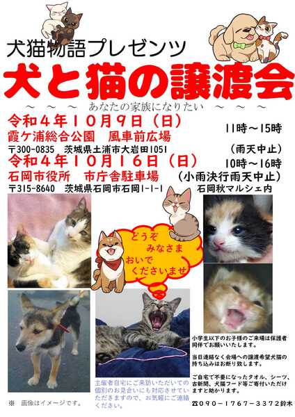 | イベント内容 | 茨城県土浦市の霞ヶ浦総合公園、風車前広場での犬猫譲渡会です。 かわいいわんにゃんがあなたとの出会いをお待ちしています。 どうぞ足をお運びくださいませ。 お問い合わせは09017673372鈴木まで。 非通知には出ません。 |
