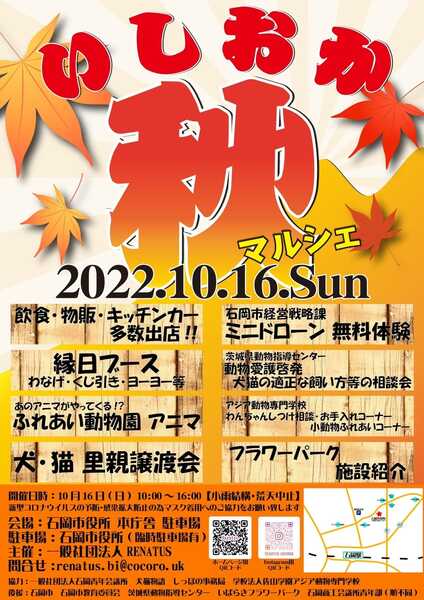 | イベント内容 | 石岡市役所駐車場で開催される石岡秋マルシェさん内での犬猫譲渡会です。 楽しい物販やキッチンカー、動物指導センターの啓発ブースなどもあり、楽しめると思います。 ぜひ、あなたを待つ可愛い子たちに会いに来てくださいませ。 お待ちしています! 問い合わせは09017673372鈴木まで。非通知には出ません。 |