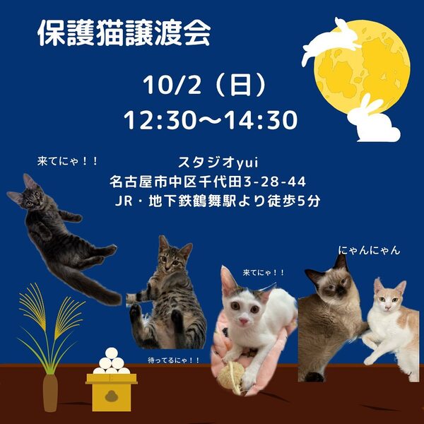 | イベント内容 | ひげねこ会・ドッグプランニング 合同で譲渡会を開催します。 ☆参加予定の子達を紹介しています ドッグプランニング☆インスタグラム https://www.instagram.com/yuko9124/ ☆sabuntama インスタグラム https://www.instagram.com/sabuntama/ ☆会場 愛知県 名古屋市中区千代田三丁目28-44 レンタルスタジオYUI(鶴舞高架下) ☆12:30~14:30 JR・地下鉄鶴舞駅から徒歩5分 ☆駐車場 鶴舞交差点~南のJR中央線ガード西側道路は休日駐車禁止解除になっています。 (休日駐禁解除区間に空きが無い場合は、コインパーキングをご利用ください。) 事前の予約は不要です ご来場お待ちしています☆ |
