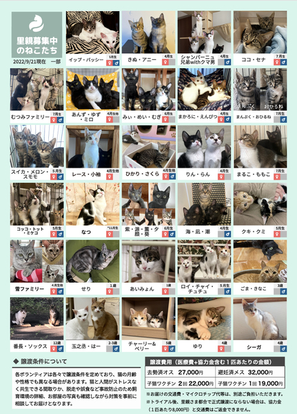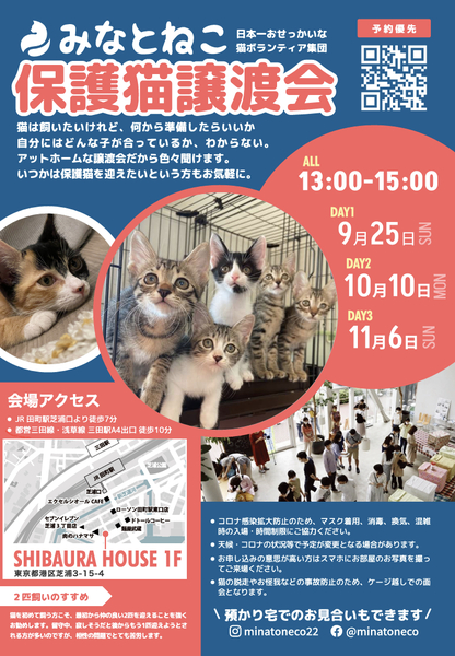 | イベント内容 | 2021年も250匹もの猫と里親さんのご縁を繋いだ毎月定期開催している譲渡会です。 なるべくゆっくりご相談など承れるよう、また、新型コロナの感染拡大防止の観点から予約優先、混雑時は入場をお待ちいただいたり、マスクの着用と消毒のご協力をお願いしております。換気のためにドアをオープンしての開催のためにケージ越しでのご対面となりますことご理解ください。 みなとねこは現在地方の協力ボランティアさんの元にいる子猫も合わせると今年生まれの子猫が110匹おります。 譲渡会には20ケージ 40匹ほどの参加となりますが、預かり宅の子猫もご紹介可能です。 みなとねこは子猫は2匹ペアでの譲渡が原則です。 初めての方こそ最初から2匹をお勧めしています。 また私たちボランティアはご縁のあった猫たちに終生里親様に愛されて幸せに安全に暮らして欲しいと願っています。 このため里親になっていただくにはいくつかの条件やお約束事があります。 ■里親申込 事前誓約書 https://www.minatoneco.com/_files/ugd/e72471_36ca5cf952ad41d0bbd8bf74d73f129f.pdf 会場では申込書とお部屋のお写真を拝見してお迎えまでにご準備いただきたいことなどご説明します。 ■里親申込書 https://acrobat.adobe.com/link/review?uri=urn:aaid:scds:US:09da8ad4-2f33-4051-86e5-2ae4b56a024b#pageNum=1 会場にてご記入いただくことも可能ですが、お手元で印刷可能でしたら、ご記入の上ご来場いただくことをおすすめしております。 ※事前誓約書の3と4に該当がある方は是非事前にご相談ください。 また猫それぞれの月齢や保護主の考えにより、譲渡条件が加わる場合があります。 実際の参加予定猫は10/10(日)21:00までにみなとねこのHP(https://www.minatoneco.com/gallery)やFacebookページ(https://m.facebook.com/minatoneco/)でご紹介します。 直接ご応募の方は詳細をLINEなどでやりとりの上で預かり宅でのお見合いも行っております。 そうした中で譲渡会前に里親様が決定することもございますことご了承ください。 譲渡会のご予約はみなとねこのHPよりお願いします http://www.minatoneco.com |