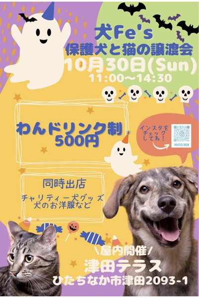 | イベント内容 | 10.30(日)11:00〜14:30 in 津田テラス(北勝園) 雨天決行(屋内開催) 中庭のある広いcafe併設の建物で 譲渡会を開催します 犬猫も人も笑顔であふれる一日となりますように ※予約不要 わんドリンク制(500円) ★参加犬猫の情報や会場の様子などは 犬Fèsのインスタグラムアカウントをご覧ください。 https://www.instagram.com/inufes.1028/ アカウント:inufes.1028 ★当日ドッグウェアなど少数店舗ですが物販あります ★ドッグマッサージの出店があります ((ドッグマッサージの予約承り中!)) ★津田テラスの美味しいランチや デザートも楽しめます♫ 津田テラス住所 〒312-0032 茨城県ひたちなか市津田2093−1 --- ※中庭に出て保護わんと先住わんを会わせることができます。(猫はNG) 先住わんちゃんは必ずリード装着・トイレマナーを守ってご参加ください ・ 各保護主により応募条件や譲渡費用は異なります。 ・ 当日、犬猫のお渡しはしていません。 ・ 会場内ではマスクの着用をお願いします。 (検温や手指消毒も行います) 主催:犬Fés2022(犬フェス) |