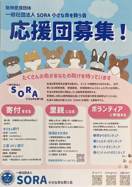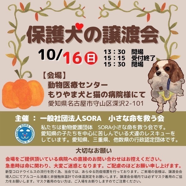 | イベント内容 | 保護犬の譲渡会を開催致します。 【注意】会場をご提供頂いている病院への直接のお問い合わせはお控えください。 急患時は命に関わり、大変ご迷惑となります。 ご配慮のほどお願い申し上げます。 もりやま犬と猫の病院さま 2階会議室 〒463-0811 名古屋市守山区深沢2-101 《ご注意》 家族希望ワンコがいる場合のお見合いに限定させていただきます。 事前のお申込みは不要です。保護活動ブログで、開催日の数日前に譲渡会参加が決定したワンコたちのご案内もしておりますので、ご希望のワンコの参加をご確認してお越し頂けますと幸いです。 なお、新型コロナウィルス感染拡大の状況におきまして、中止させていただくこともございますのでご了承下さい。 SORA公式ホームページ https://sora-chiisana.org/foster/ SORA公式活動メインブログ https://ameblo.jp/sora-chiisana-inochi/ SORAイベントブログ https://ameblo.jp/sora-charity-events/ |