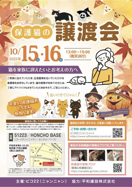 | イベント内容 | 2022年 10/15日(土)、16日(日) 時間:12:00~15:00(雨天決行) <猫を家族に迎えたいとお考えの方へ> ご家族に迎えていただき、生涯愛情を注いでいただける里親様をお待ちしています。 猫の飼育が初めての方には、丁寧にアドバイスもさせていただきますので、ご安心ください。 会場:51223/HONCHO BASE(ゴーイチニイニイサン/ホンチョーベース) 戸田市本町5-12-23 埼京線 戸田公園駅(西口)徒歩3分。 ※戸田公園駅西口ロータリーを出て、オリンピック通りの本町二丁目交差点を横断し直進してく ださい。 立て看板のある細い道を左折してください。 お車の方は、付近のコインパーキングをご 使用ください。 ※会場までのルートは、以下のサイト内の動画をご参考になさってください。 <譲渡会に関してのお願い> 新型コロナウイルス感染予防対策を万全に行い実施いたしますので、 会場内はマスクの着用をお願いいたし ます。ご出発前に検温をお願いいたします。 会場にお入り頂く前に検温・消毒をお願いいたします。 <譲渡会に参加をご検討の皆様へ> 会場内の蜜を避けるため、ご予約をお願いいたします。 予約なしでも可能ですが、ご予約優先となりますので、お外でお待ちいただくこともございます。 皆様のご理解、ご協力をお願いいたします。 ご予約は、以下のサイト内お問い合わせフォームよりお願いいたします。 ●ご予約・お問い合わせ:ピコ22(ニャンニャン)https://www.officemirai.com/cat ●保護猫の情報ブログ『保護猫活動日記』:https://ameblo.jp/toko-chino/ |
