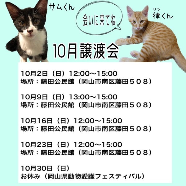 | イベント内容 | 10月23日(日)12-15時、藤田公民館にて犬猫の譲渡会を開催します! ⚠️新型コロナウィルス感染症感染防止対策のため、発熱等、体調不良のある方は来場をお控えください。 来場の際はマスク着用の上、入場前の手指消毒と検温にご協力をお願い致します。 ご希望の子がいましたら、是非事前にホームページからお問い合わせ下さい! (⚠︎会場への直接のお問い合わせはお控えください) 【予約、お問い合わせ、詳細や日常の様子はこちらから↓】 ●HP https://www.wanpark.org/ https://www.instagram.com/wan89.okayama/ https://www.facebook.com/wan89okayama/ 予約優先、1組30分厳守のご案内です。 |