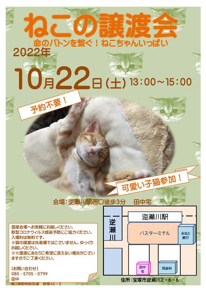 | イベント内容 | 命のバトンを繋ぐ!ねこちゃんいっぱい! 今回は子猫も大人の子も参加いたします。大きい子も子猫も見て頂けると思います。生後約3ヶ月前後〜少し大きくなった子や2歳位の子が参加します。 よく慣れている子ばかりですので、どの子も性格の良いオススメのかわいい子ばかりです。 参加ねこは ワクチン接種、ノミダニ回虫 駆除(大きな子は避妊去勢手術済み)をしていつでも家族に迎えて頂くための準備を行いました。 保護猫は一般家庭でのびのびと保護されている子ばかりです。元気にすくすく育っています。 ☆第2種動物取扱者が開催いたします☆ |