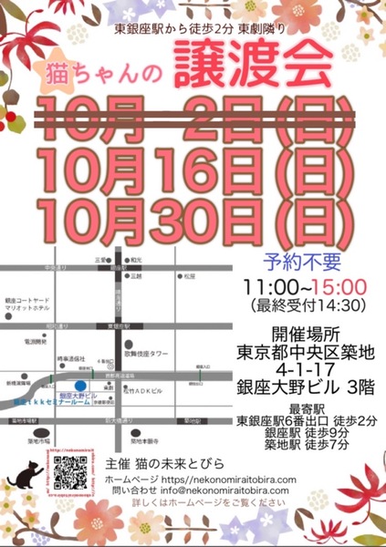 | イベント内容 | 東銀座で保護猫の譲渡会を開催しています「猫の未来とびら」です♪ 恵まれない環境にいる猫たちが未来へのとびらを開いて幸せなご縁に繋がる橋渡しをしていきます。 たくさんの猫ちゃんと保護主・スタッフ一同みなさまのご来場を心よりお待ちしています! 子猫ちゃん〜成猫ちゃんまで参加します♪ ※ご来場頂く方と私たち保護主、スタッフの安心と安全の為、感染リスクを限りなく低減させる為、私たちが出来うる対策をしてお待ちしております※ 【ご来場いただく皆様には下記についてお願い致します】 ★不織布マスクの着用をお願い致します。 (マスク着用のない方は入場出来ません) ★譲渡会場にお入り頂く前に検温・手洗いと手の消毒、検温をお願い致します。 ★ソーシャル・ディスタンス(人と人との間隔を開ける)をお願い致します。 ★熱のある方や体調の優れない方は譲渡会への来場を見合わせて頂けますよう、お願い致します。 ★来場者数によりましては人数制限もありますので長時間お待たせてする場合もございます。 予めご了承下さい。 コロナウイルス感染拡大防止の為、このような厳しいお願いで大変恐縮ですが何卒ご理解とご協力、ご了承をいただけますようお願い致します。 ★☆★★☆★★☆★★☆★★☆★★☆★★☆★★☆★★☆★ ★開催日時 2022年10月16日(日) 11:00~15:00(最終受付 14:30) ★会場 東京都中央区築地4-1-17 銀座大野ビル 3階 (東劇となり) ★最寄駅 東銀座駅 6番出口 徒歩2分 銀座駅 徒歩9分 ・築地駅 徒歩7分 駐車場は当ビル又は近隣のコインパーキング等をご利用ください。 会場への直接のお問い合わせはご遠慮くださいませ。 ★☆★★☆★★☆★★☆★★☆★★☆★★☆★★☆★★☆★ 会場で猫ちゃんと触れ合ってご縁を繋いでください。 里親様・猫ちゃんが双方、幸せな家族になれるよう保護主・スタッフがサポート致します。 ご不安な事はお気軽にご相談ください。 入場無料です。事前のご予約は不要です。 当日猫ちゃんの引き渡しはございません。 後日、保護主が里親様宅へお届けいたします。 ※参加予定猫ちゃんは、急な体調不良等で不参加になる場合もございます。 開催当日の朝、当会ブログにて不参加の最新情報を掲載致しますのでご確認をお願い申し上げます。 ◇譲渡に関してのお願い・基本条件 1.家族の一員として終生最期まで愛育下さい。 2.完全室内飼い・ペット可のお住まい(契約書を拝見致します) 3.脱走防止対策 4.避妊・去勢手術 5.里親様のご自宅へのお届け 6.譲渡誓約書への署名捺印・身分証明書の提示 7.医療費譲渡金のご負担 8.定期報告 9.トライアル期間有り ※保護主により譲渡条件は異なりますので会場で直接ご相談ください。 60才以上の方のみのご家庭、未成年の方、単身の方、同棲中の方、 小学生低学年以下のお子様のいる方、必要な脱走対策を施していただけない方は譲渡をご遠慮頂く場合もございますのでご了承ください。 仔猫の場合は主にお世話される方のご年齢は55歳までとさせて頂きます。 オーバーする方はご相談くださいませ。 小さな子猫の譲渡は体重が1kgになってからのお届けやお留守番の無い(少ない)ご家庭を希望いたします。 医療費譲渡金に関しましては詳しくはホームページの 【譲渡に関してのお願い】【譲渡の流れ】をご覧くださいませ。 ~主催 猫の未来とびら~ |