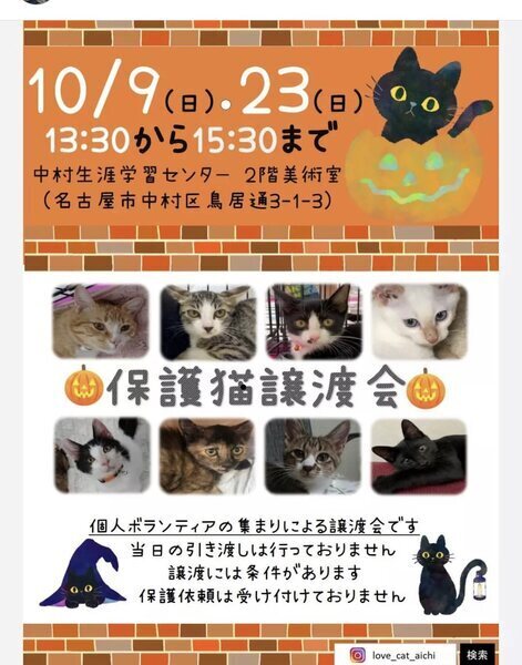 | イベント内容 | 個人ボランティアの集まりによる猫の譲渡会です。 子猫20頭ほどと多数の成猫が参加します。 是非ともお気軽に会いに来てやってください。 譲渡にはペット飼育可能のお住まいである等の条件があります。 当日のお渡しはしていません(お届けのみになります) 引き取りはできません。 ご相談等は混雑状況により後日改めてということになるかもしれませんが ご了承ください。 |
