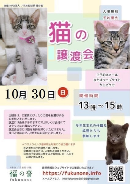 | イベント内容 | 今回は、たくさんの仔猫が参加予定です♪ 保護された猫が参加して、新しいお家を求めて参加します(=^・^=) 猫は後日こちらからお届けをさせて頂き、お家の環境を見せて頂ければと思います。 猫は20年くらい生きる子もいますので、ご自身の年齢に合った猫さんとの出会いを探しに来てください。 ペット不可にお住まいの方はご遠慮ください!(ご確認ください) 仔猫の場合は、お留守番が長いお家には難しいですので、ご了承ください。 譲渡には条件が多数ありますので、ご理解くださいませ。 里親希望の方は予約優先ですので、出来れば下記に連絡をください。 ご予約は、アドレス miina0807@y5.dion.ne.jp です。 お越しの際はJR芦屋駅からは徒歩3分、車でお越しの場合は近隣にコインパーキングがあります。 当日、体調の悪い方、発熱がある方、このような方はご遠慮ください。 毎月、最終日曜日に開催予定にしておりますが、変更もありますのでご確認ください。 こちらでは、体温チェックや消毒をし、万全を期しております。 |