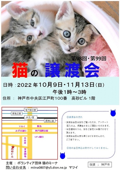 | イベント内容 | 今回は、大人猫も仔猫もたくさんの猫たちが参加予定です。 保護された猫たちが参加して、新しいお家を求めて参加します(=^・^=) 猫は後日こちらからお届けをさせて頂き、お家の環境を見せて頂ければと思います。 猫は20年くらい生きる子もいますので、ご自身の年齢に合った猫さんとの出会いを探しに来てください。 ペット不可にお住まいの方はご遠慮ください! 譲渡には条件が多数ありますので、ご理解くださいませ<m(__)m>。 まずはお試しで猫との相性を見てから、正式譲渡となります。 また、猫を参加させたい方も、募集していますのでお申し込みくださいね! アドレス miina0807@y5.dion.ne.jp にご連絡をください。 お越しの際は各路線の三宮駅からは徒歩10分くらい、車でお越しの場合は近隣のコインパーキングなどにお停めください。 当日、体調の悪い方、発熱がある方、このような方はご遠慮ください。 こちらでは、体温チェックや消毒をし、万全を期しております。 密にならないように、人数制限をしておりますので、お待ち頂く場合があります。 ブログ: 猫のミーナといっしょ http://miina300.blog.fc2.com/ ねこのオカン https://ameblo.jp/miina300/ |