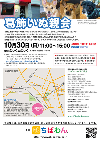 | イベント内容 | 葛飾区鎌倉のいぬ同伴美容室・喫茶“どっくwどっぐ”の店舗にていぬ親会を開催します。 可愛い保護わんこたちが新しい家族との出会いを求めて参加します!! いぬ親会見学は予約等必要ありません。 是非、ご家族同伴でご来場下さい。 【ちばわんからのお願い】 ①会場内ではマスクの着用をお願いします。 ②入場の際、検温と消毒をいたします。体温が37.5℃以上の場合、入場をお断りさせていただく場合があります。 ③会場内が密にならないよう入場制限をさせていただく場合があります。 開催日:10月30日(日)11:00~15:00 室内開催 雨天決行 場所: どっぐwどっぐ 東京都葛飾区鎌倉3-16-13 《アクセス》 【駅からのアクセス】 新柴又駅より徒歩約5分。 駅直結の陸橋を通り、高架線路沿いの細道を進みます。 (セブンイレブンは店内通り抜けできます) 鎌倉公園沿いの細道の突き当たりを右に曲がりすぐに左折してください。 道路右側に民家が並んでいます。4軒目のピンク色の壁の店です。 ※店舗に駐車場はありません。 当日お車の方はコインパーキングをご利用ください。 《注意事項》 【当日の流れ】 (1)家族募集中のいぬとお会いになりたい方はどなたでも自由にご参加いただくことができます。ちばわんボランティアは名札をつけておりますので、ご遠慮なくお声をかけて下さい。また、募集中のいぬのそばには預かりボランティアが控えておりますのでいぬの性格や生活習慣など、遠慮なくご質問ください。 (2)ご希望のいぬが決まったら、お申し込みアンケートにご記入の上、ボランティアにお渡し下さい(前日までにメールでアンケートを送信してお申し込みいただくこともできます。) ◆「いぬ」アンケート送信先:http://chibawan.net/contactform_dog (3)アンケート内容を拝見し、お話させていただきます。 (4)原則として一両日中にお返事の連絡をさせていただきます。 (5)ご縁が成立した場合には、後日、こちらからご自宅までいぬをお届けし、約1ヶ月のお試し生活に入っていただきます。お届けの際に、書面での譲渡契約書を交わします。 ※ワクチン・不妊手術代など保護犬にかかった費用は、家族になるいぬ親さんにもご負担をお願いしています 《お知らせ》 会場ではチャリティグッズを販売します 売上金は保護した犬猫の医療費など、 ちばわん活動費として大切に使わせていただきます 《お問い合わせ》 いぬ親会について:http://chibawan.net/inquiry_dog_other ※いぬ親会当日はメールが見られません。また、お問い合わせの際は、必ず「具体的な件名」を入れて多数の迷惑メールと区別がつくようにお願いいたします。 葛飾いぬ親会イベントページ https://chibawan.net/event/20221030katsushika-dog ちばわんホームページ https://chibawan.net/ |