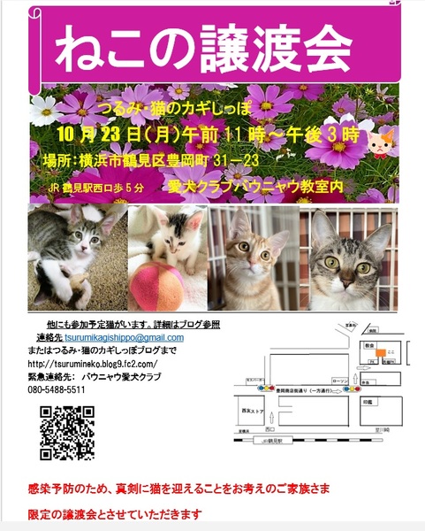 | イベント内容 | 10月23日(日)つるみ・猫のカギしっぽ 定例譲渡会を開催いたします JR鶴見駅西口から徒歩5分 横浜市鶴見区豊岡町31-23 愛犬クラブバウニャウ 教室内 午前11時~午後3時 会のブログはこちら つるみ・猫のカギしっぽ http://tsurumineko.blog9.fc2.com/ 参加予定猫はこちら (順次掲載します) http://tsurumineko.blog9.fc2.com/blog-entry-2767.html 感染予防のため: ①マスク着用のこと(入場中外さないでください) ②別室でお待ちいただくことがあります ③ネコを迎えることを真剣に検討されているご家族に 限定させていただきます 入場時にアンケートをご記入いただきます (連絡先等を含む) 子猫、幼猫、大人猫、みんな素敵な赤い糸を探して 参加いたします。 お問合せは会のメールアドレスにお願いいたします。 tsurumikagishippo@gmail.com 会の譲渡条件をあらかじめ御覧くださいませ (ブログ右上に「ご確認ください」とあります |